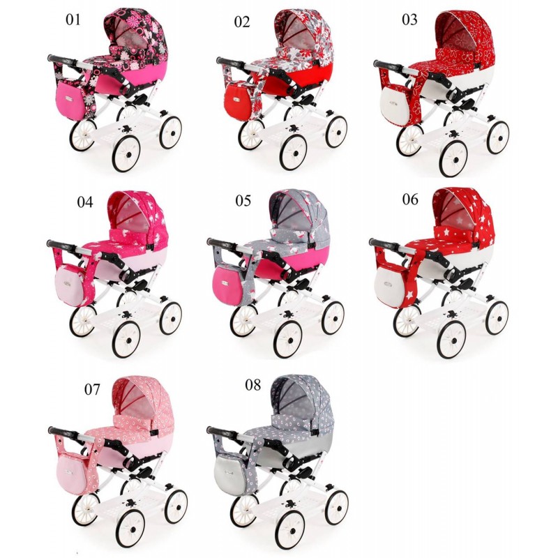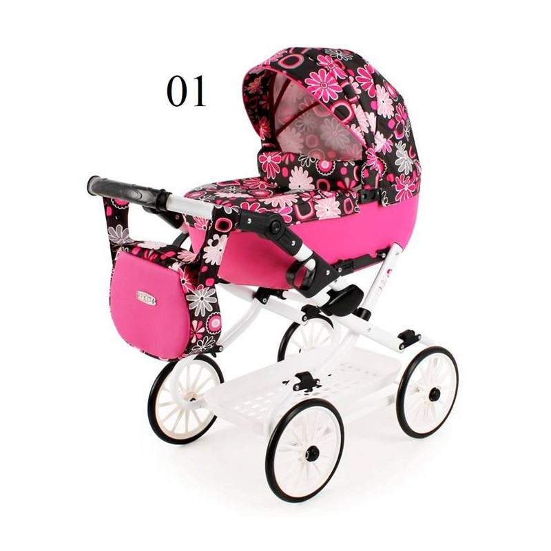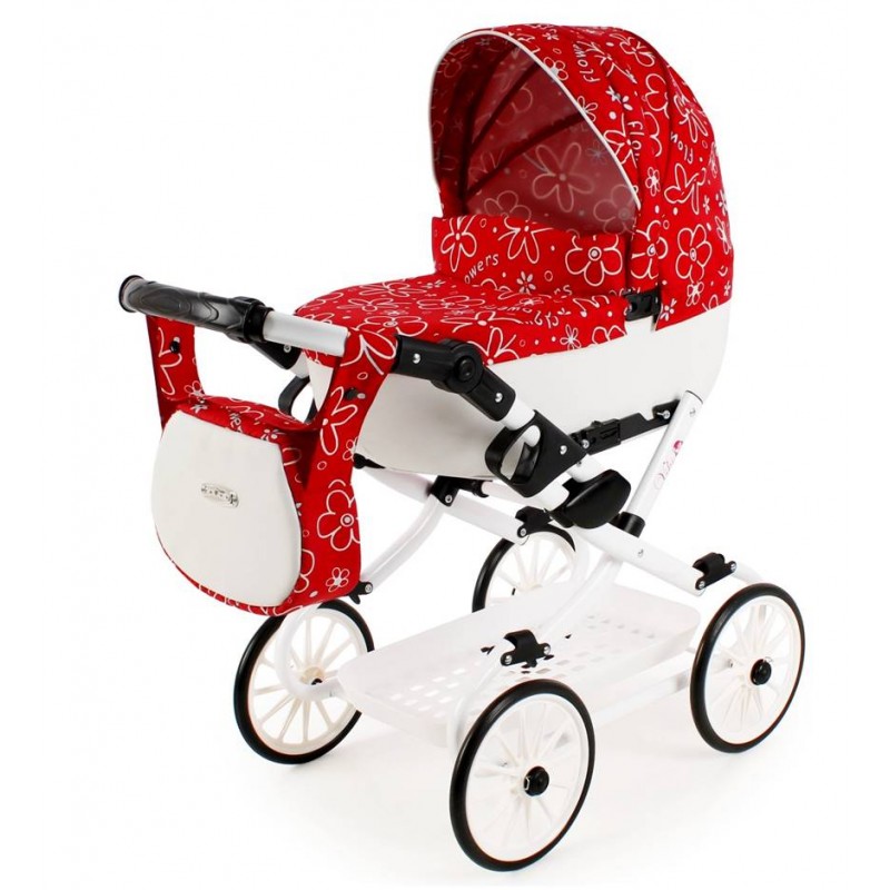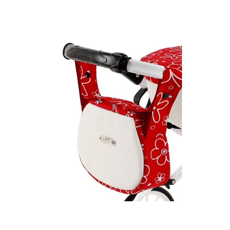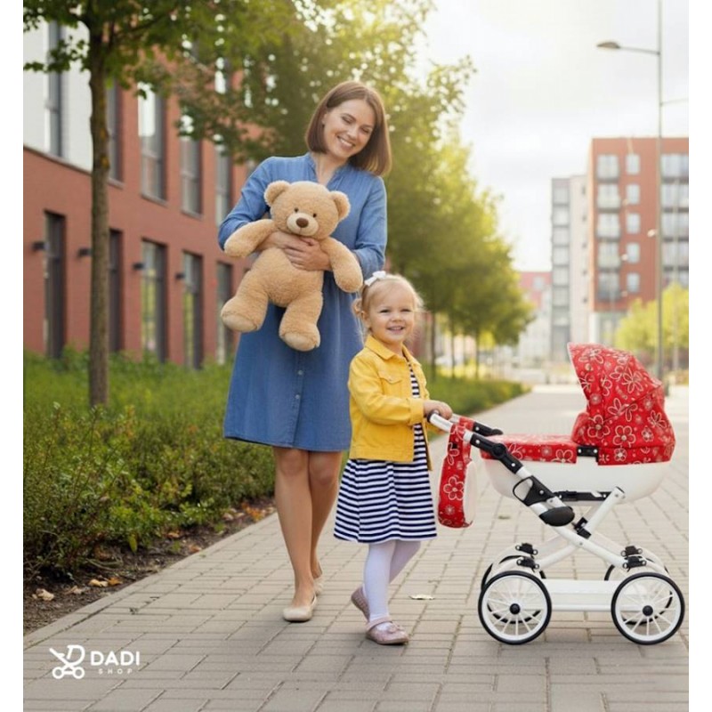 Viki w intensywnej czerwieni, przełamanej bielą i zdobionej subtelnymi kwiatuszkami, przyciąga uwagę i zachwyca detalami. Dół gondoli obszyty ekoskórą dodaje elegancji, a składany daszek chroni lalkę podczas zabawy w domu i na świeżym powietrzu.