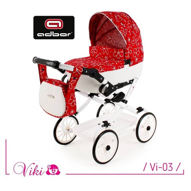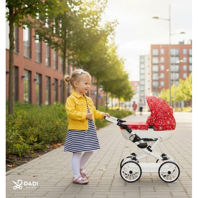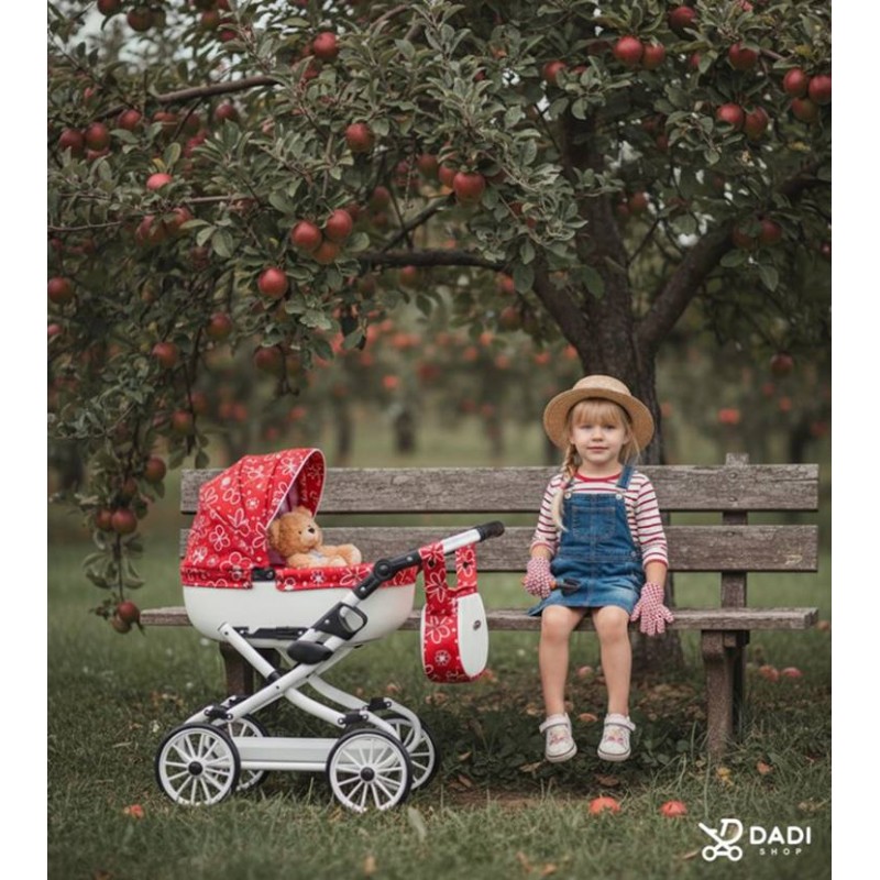 Stylowy czerwono-biały Adbor wózek dla lalek VIKI z gondolą w kwiatki rozwija wyobraźnię dziecka i zachęca do kreatywnych spacerów.