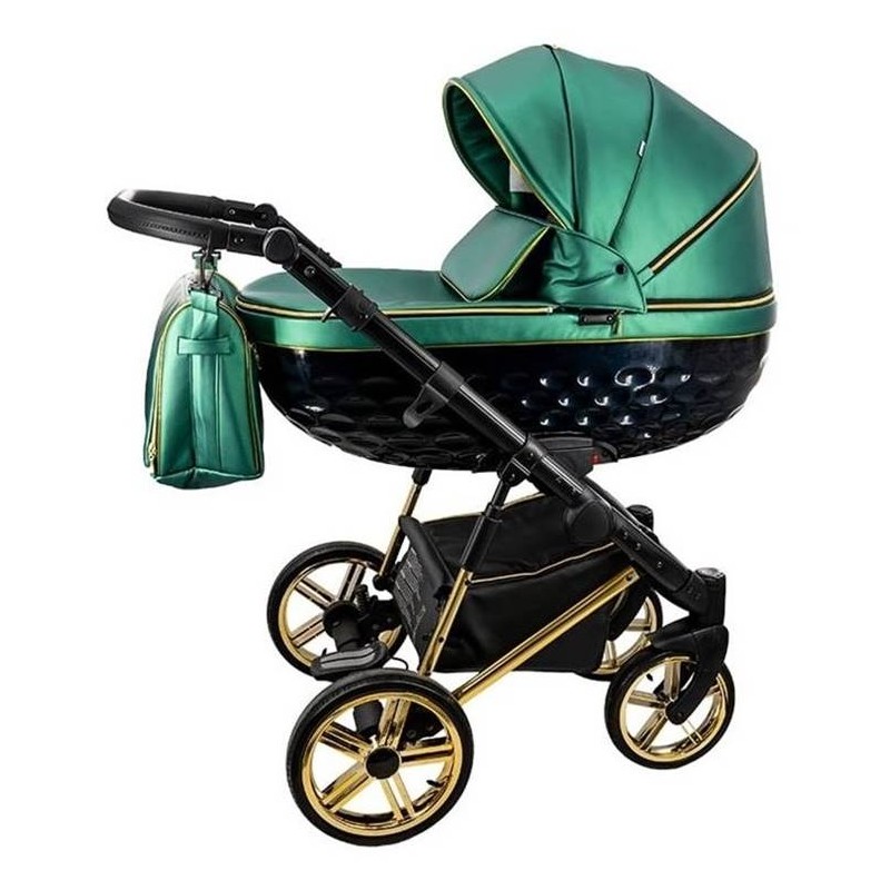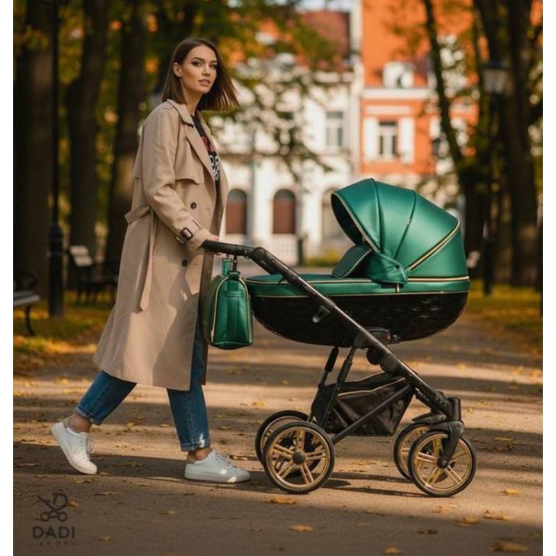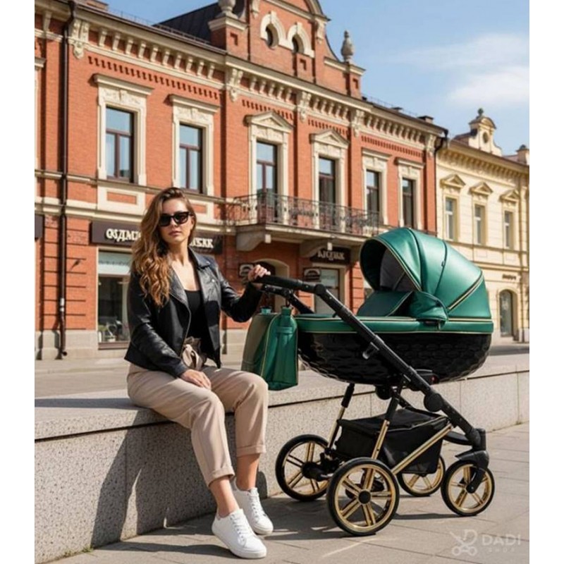 Elegancki wózek Adbor OXV 3D 2w1 w kolorze butelkowej zieleni z złotym stelażem – idealny towarzysz codziennych spacerów