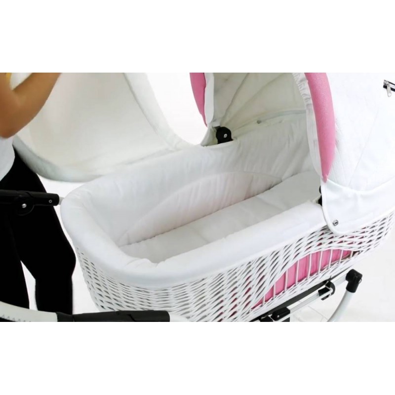 W tym modelu wózek 2w1 łączy naturalną wiklinę z wygodą codziennego użytkowania.
