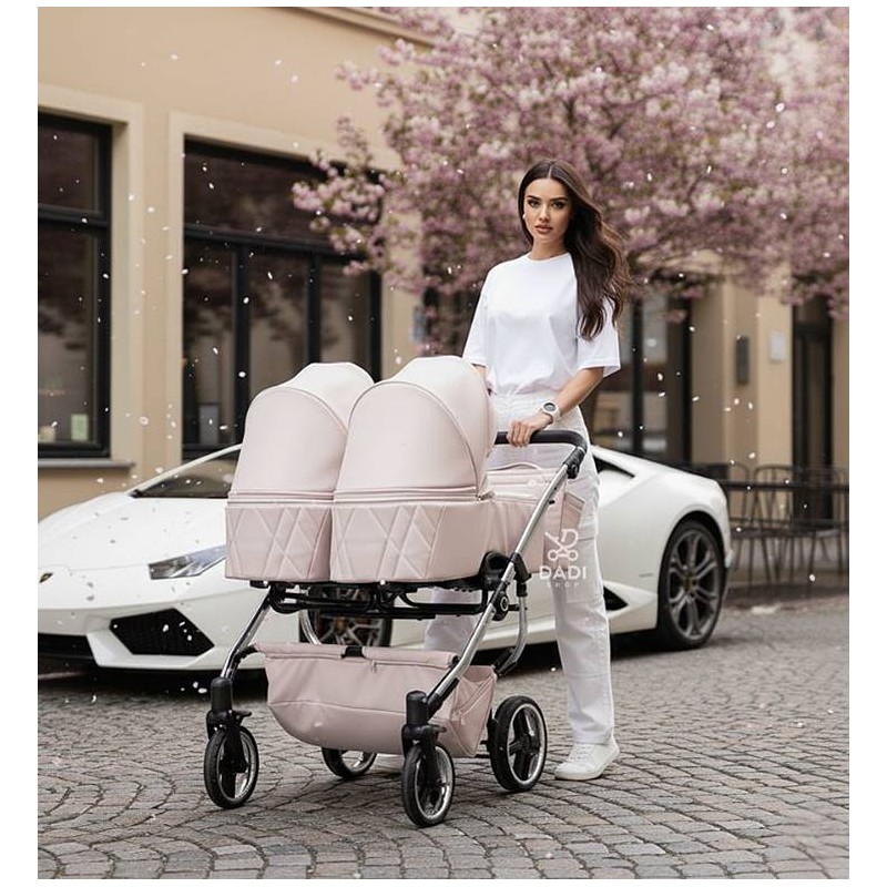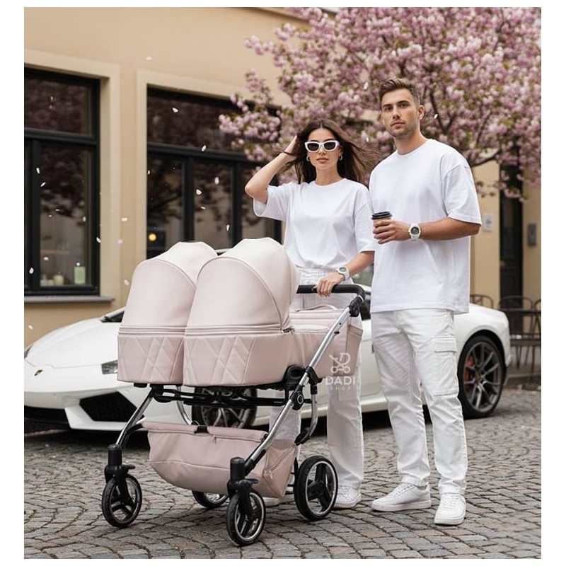 Elegancki Junama Duo V3 Eco 3w1 04 Pudrowy to idealny wózek bliźniaczy dla dziewczynek – łączy styl, funkcjonalność i komfort, a wąska konstrukcja i praktyczne funkcje ułatwiają codzienne spacery i podróże z maluszkami.