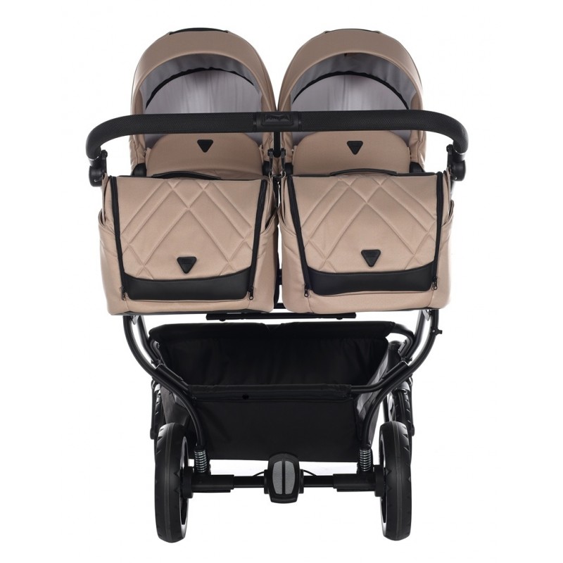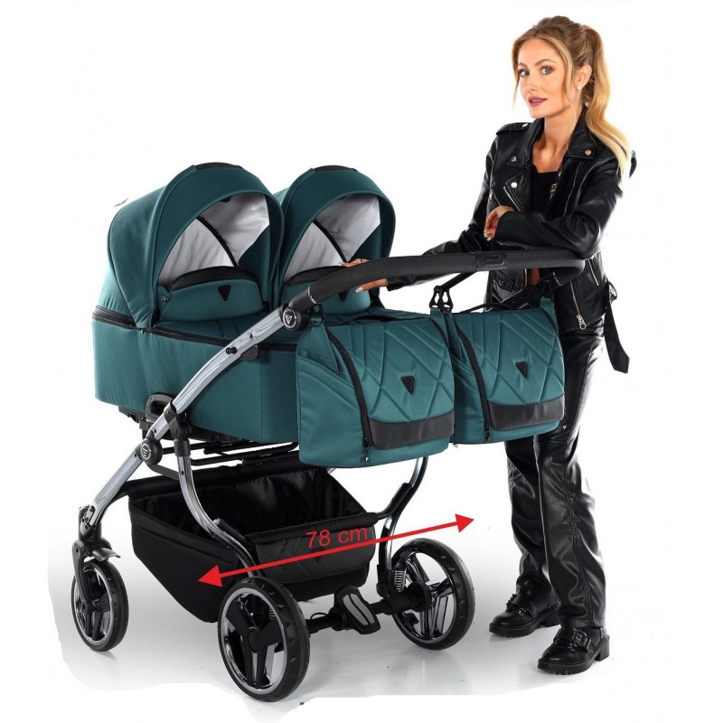 Tył wózka bliźniaczego z gondolami – wąska konstrukcja 78 cm idealna do spacerów po mieście i w wąskich przestrzeniach.