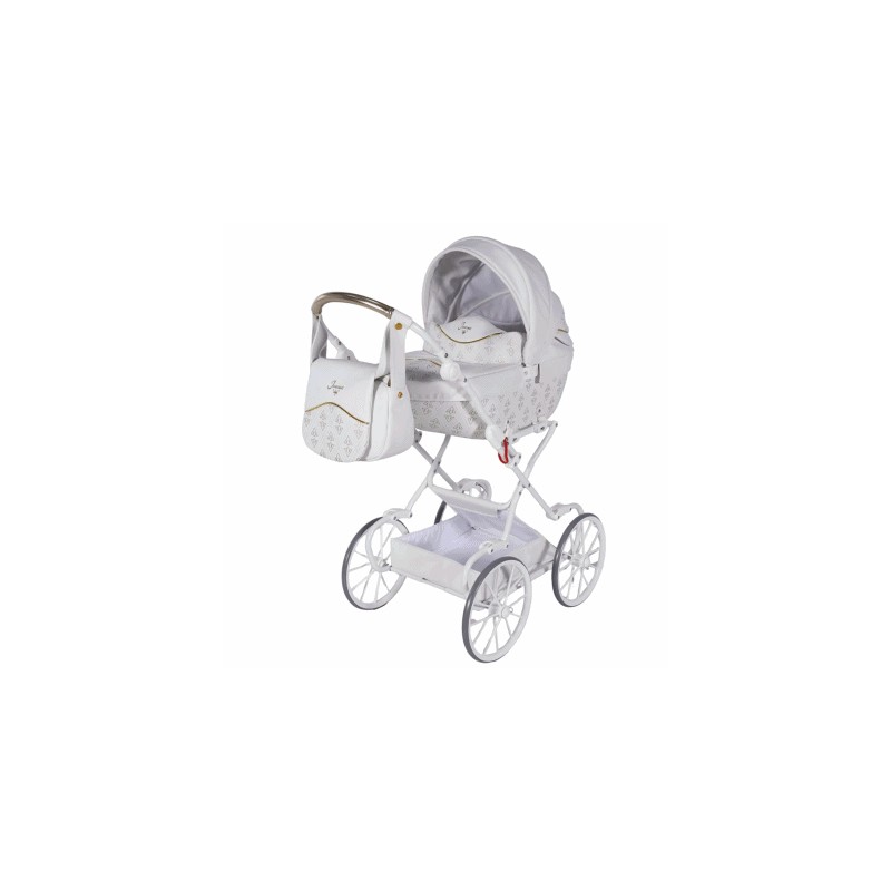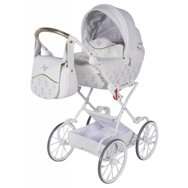 Elegancki biały wózek dla lalek Junama Art Deco Mini 01 – widok boczny.