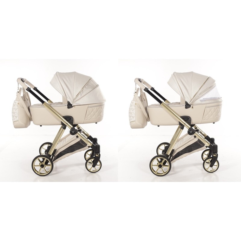 Luksusowy wózek Junama Ellegante Lame. Beżowa gondola, złoty stelaż. Stylowy wózek 2w1 premium dla Twojego noworodka!