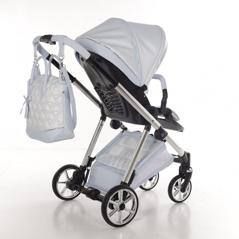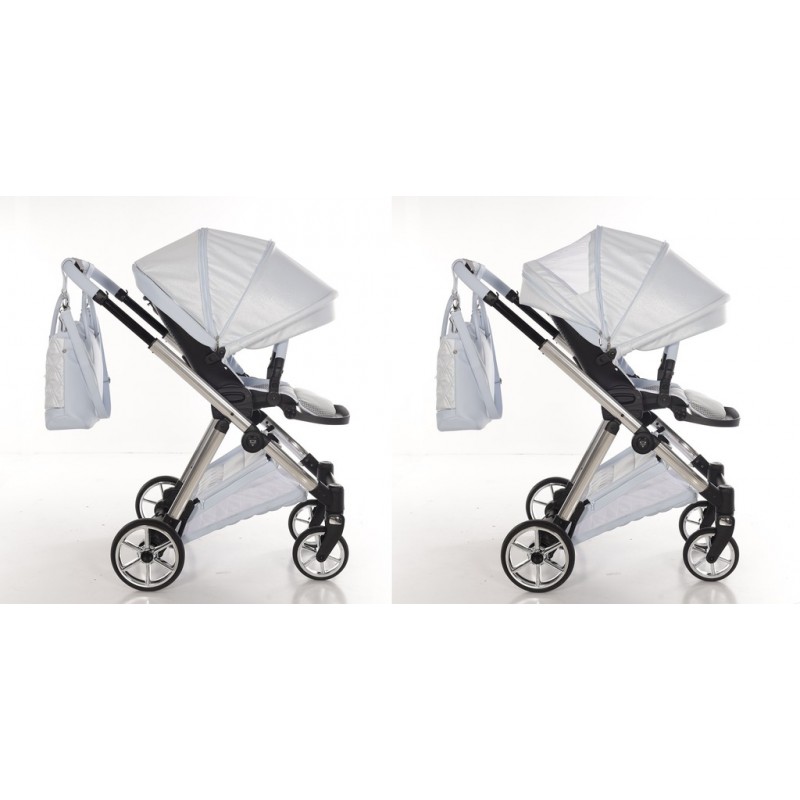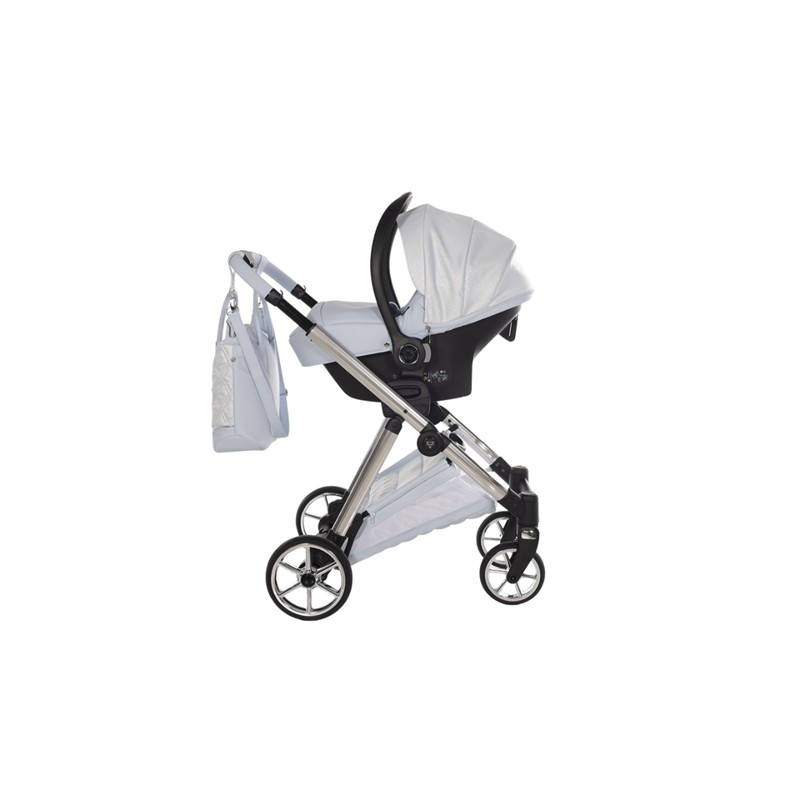 Ten moduł to wózek, który rośnie razem z dzieckiem, zapewniając mu swobodę ruchów, bezpieczeństwo i najwyższy komfort podczas odkrywania świata. Jasnobłękitna tapicerka z akcentami Lame zachowuje luksusowy i ponadczasowy wygląd całego zestawu.
