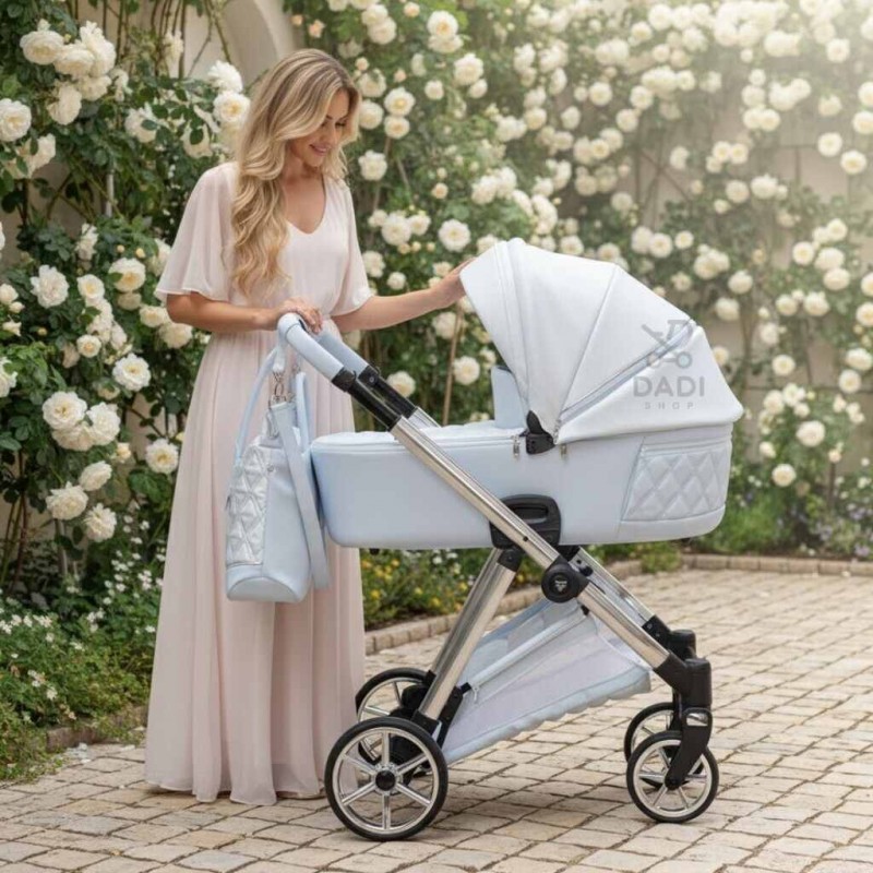 Chwila z Junama Ellegante Lame 03. Wózek Light Blue z luksusową gondolą, idealny na letnie spacery po ogrodzie. Wybierz elegancki wózek premium, który pasuje do Twojego stylu!