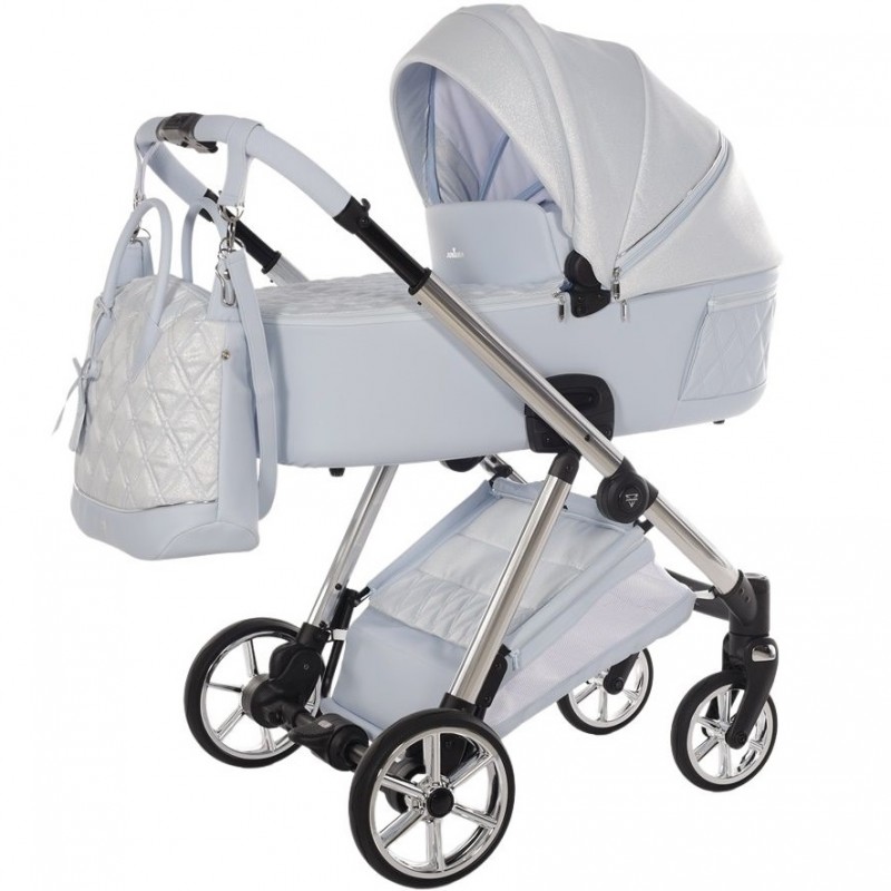 Spacer z Junama Lame 03. Wózek Light Blue z gondolą i pikowaną torbą, idealnie komponuje się z eleganckimi chwilami. Wybierz luksusowy wózek premium dla Twojego dziecka.