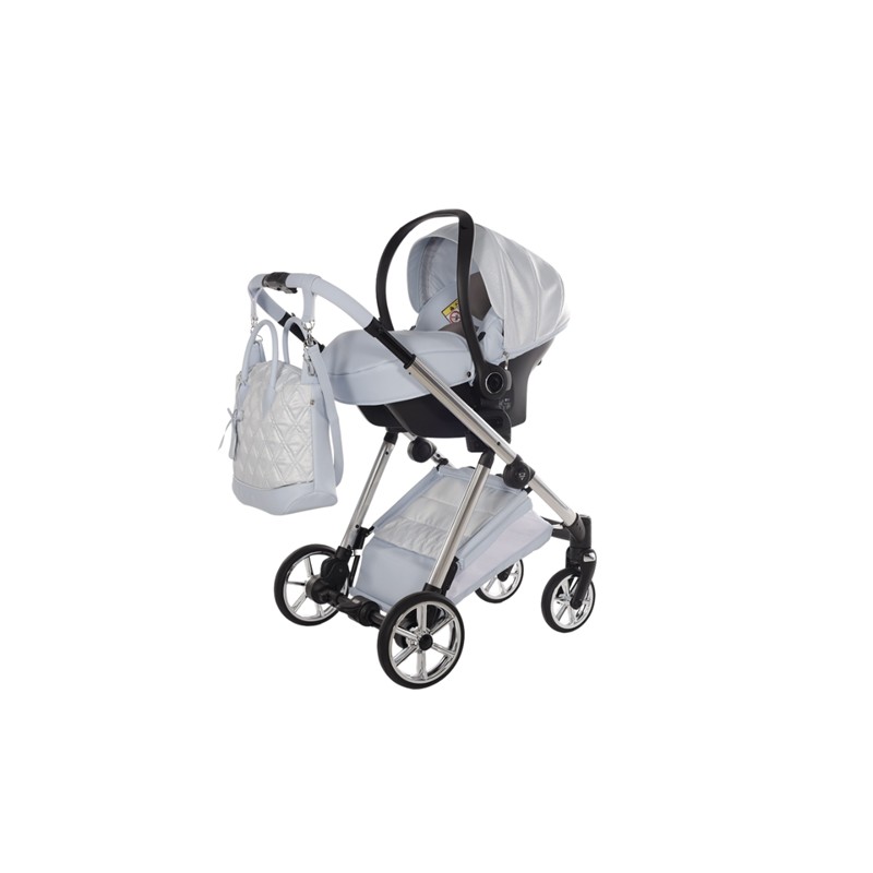 Bezpieczeństwo i mobilność! Fotelik samochodowy Junama Ellegante Lame 03 w kolorze Light Blue montowany na stelażu. Idealne rozwiązanie Travel System 3w1 dla komfortu w podróży!