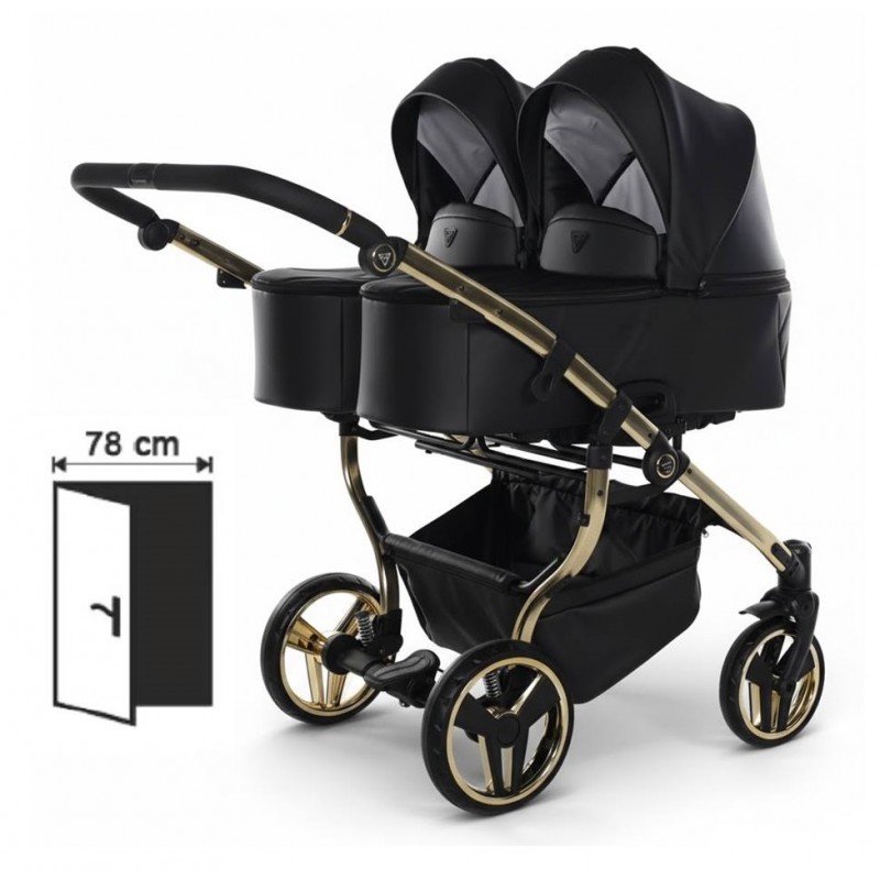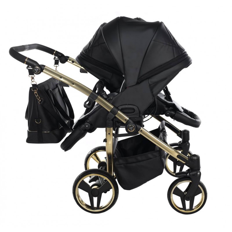 Studyjne ujęcie Junama Duo V3 Eco – stylowy wózek bliźniaczy w czerni i złocie.