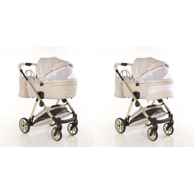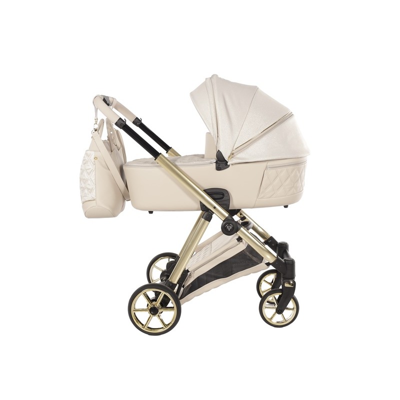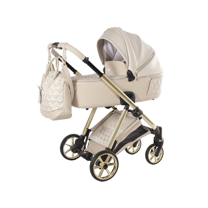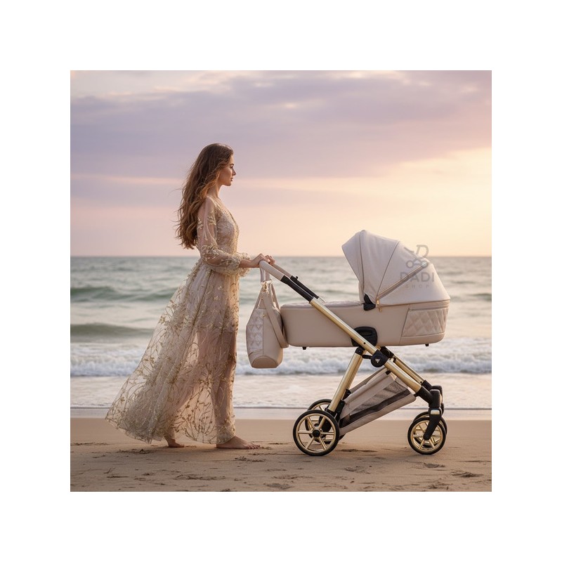 Ekskluzywny wózek dziecięcy Junama Ellegante Lame 02 Beige. Luksusowy zestaw 4w1 na złotym stelażu, gwarancja stylu premium.