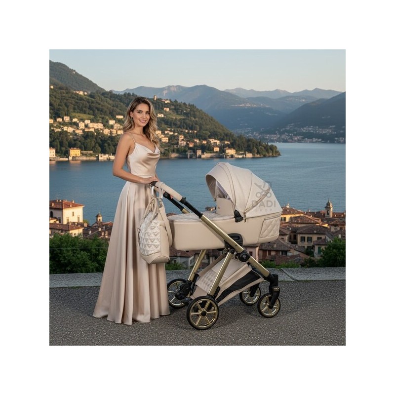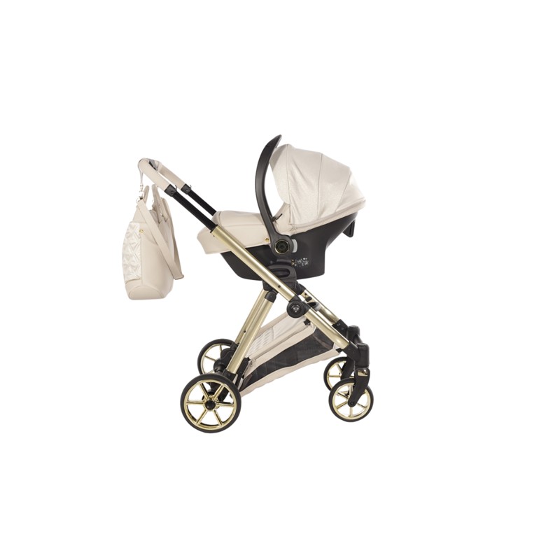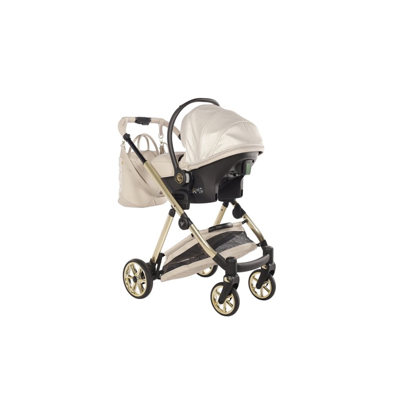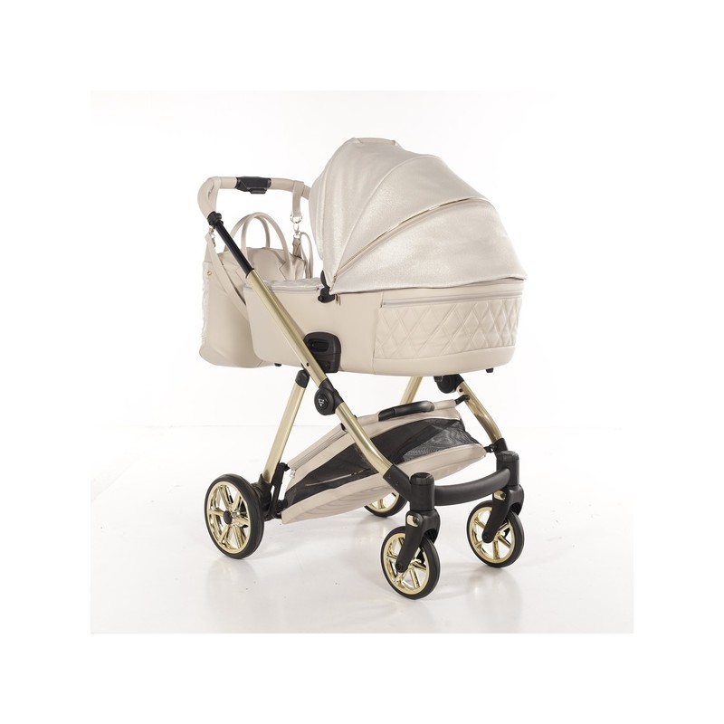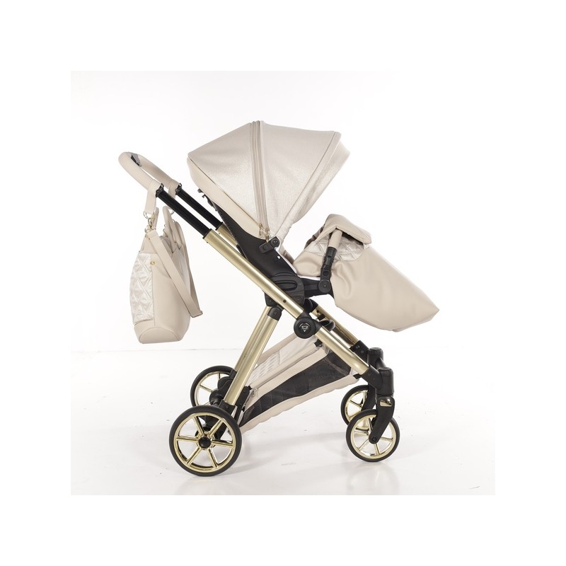 Ekskluzywny wózek dziecięcy Junama Ellegante Lame 02 Beige w zestawie 4w1 (z bazą ISOFIX). Idealne połączenie luksusu i funkcjonalności.