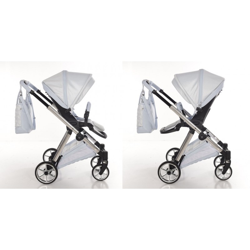 Pełna Elastyczność! Luksusowy wózek Junama Ellegante Lame Light Blue z chromowanym stelażem oferuje funkcjonalność przekładanego siedziska, idealnie dopasowując się do potrzeb dziecka i rodzica w zestawie 4w1.