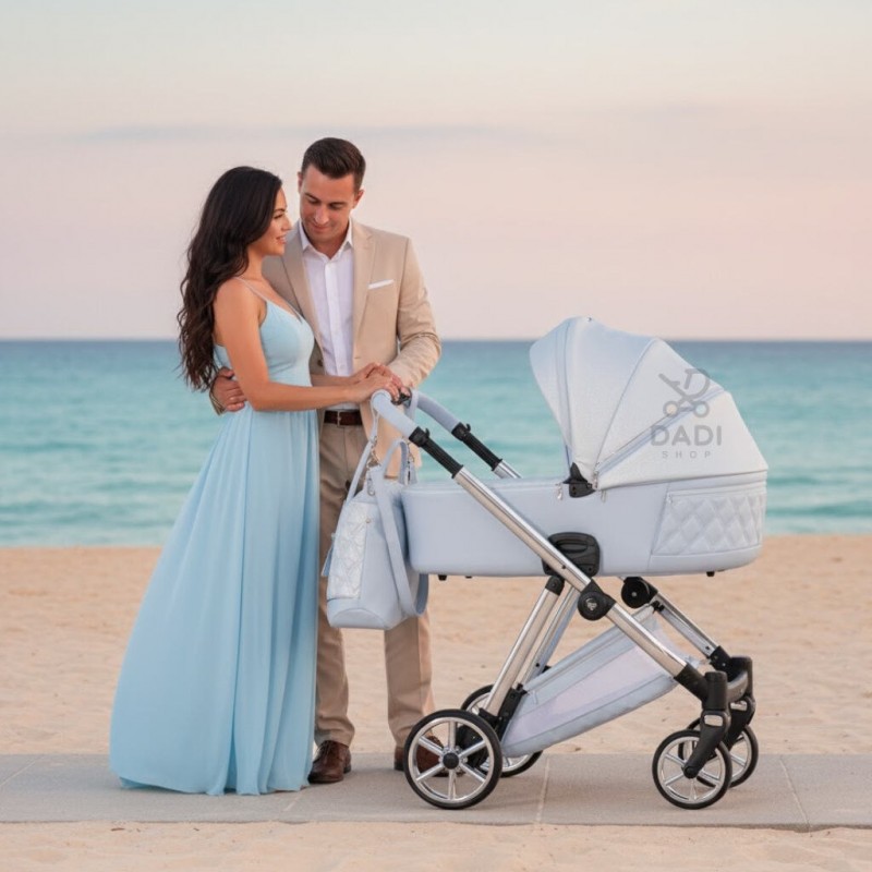 Rodzinny Prestiż! Junama Ellegante Lame Light Blue to designerski wózek 4w1, który łączy luksus Baby Blue z funkcjonalnością i stylem, idealny dla eleganckich rodziców.