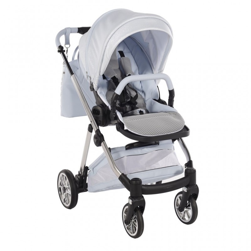 Poczuj się Królową Stylu! Junama Ellegante Lame Light Blue to designerski wózek 4w1 stworzony dla wymagających Mam. Podkreśl swój prestiż dzięki chromowanemu stelażowi.