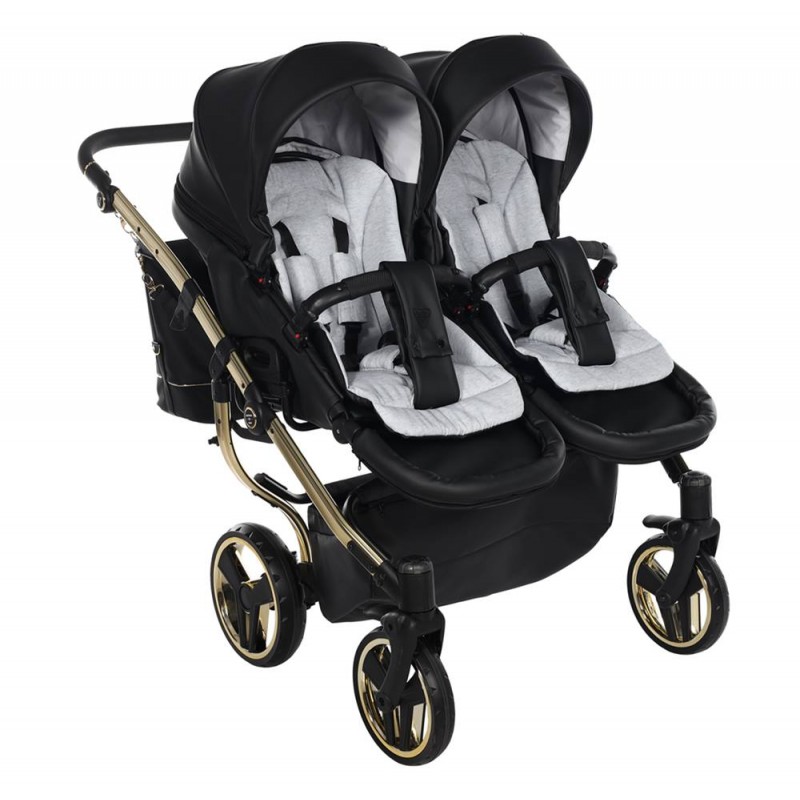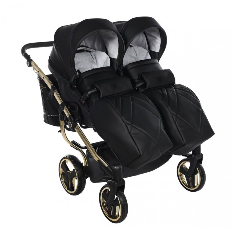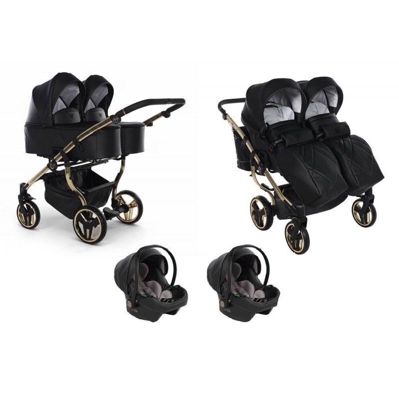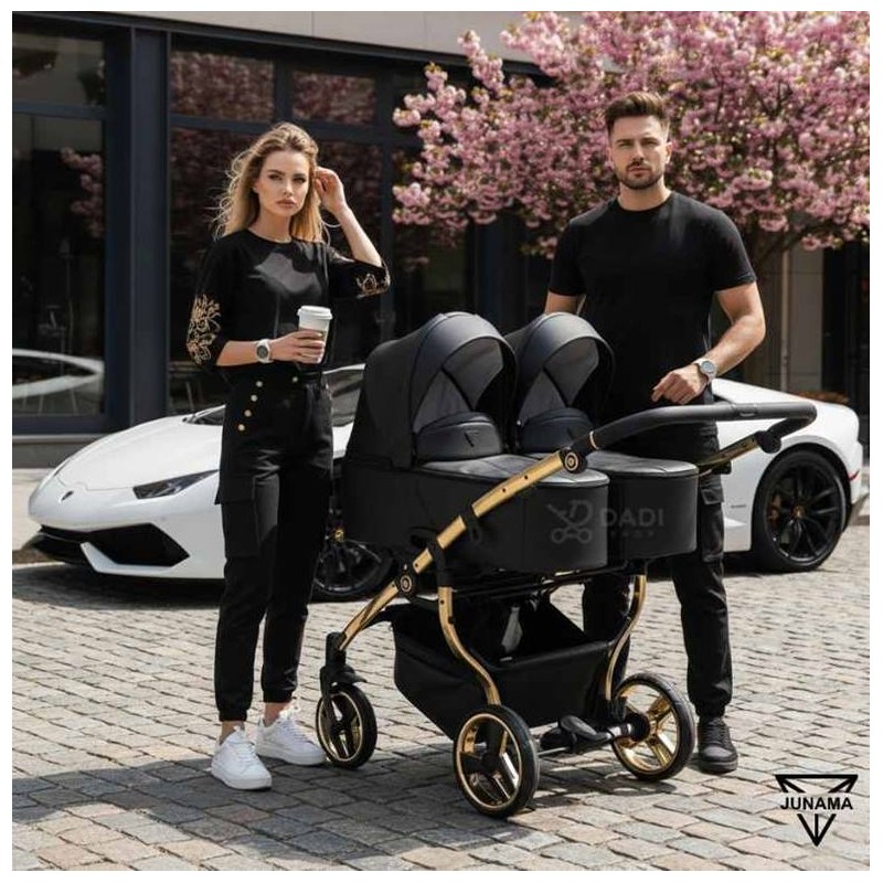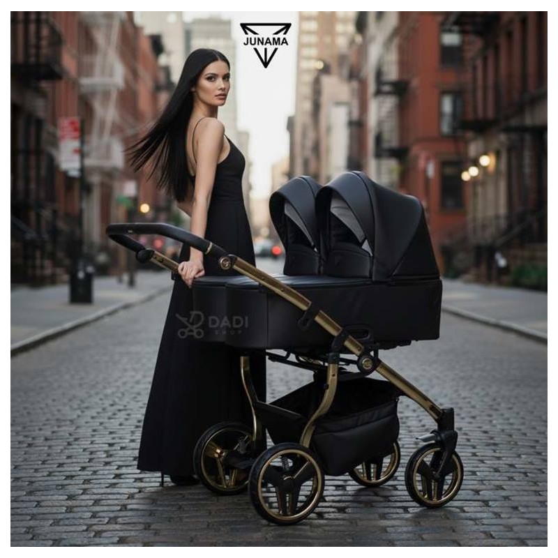 Junama Duo V3 3w1 – elegancki wózek bliźniaczy w czerni na złotej ramie, który łączy komfort, styl i funkcjonalność w eco skórze. Kompletny zestaw gondoli, spacerówek i fotelików sprawia, że każdy spacer z bliźniakami staje się przyjemnością.