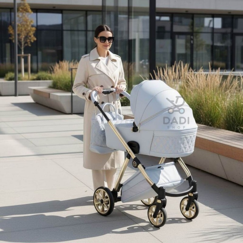 Stelaż wyposażono w intuicyjny system składania, regulowaną rączkę oraz praktyczne rozwiązania ułatwiające codzienne użytkowanie, takie jak pojemny kosz na zakupy. Solidna i trwała konstrukcja umożliwia szybki montaż gondoli, spacerówki i fotelika, tworząc kompletny wózek dziecięcy 3w1 premium. Stylowy niebieski kolor 03 Blue z detalami Art Deco nadaje wózkowi elegancki, luksusowy charakter.