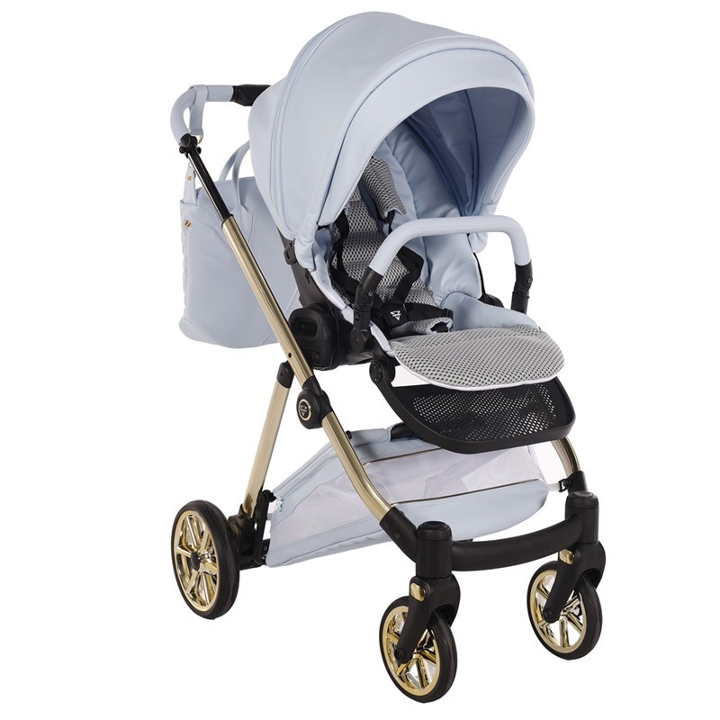 Wersja 03 Blue w niebieskiej tonacji wpisuje się w nowoczesne trendy, z akcentami Art Deco podkreślającymi luksus. To idealny wózek dziecięcy premium 4w1, łączący styl, funkcjonalność i komfort dla wymagających rodziców.
