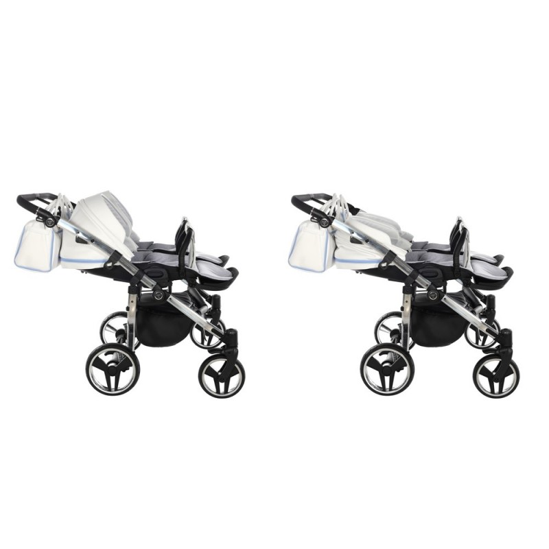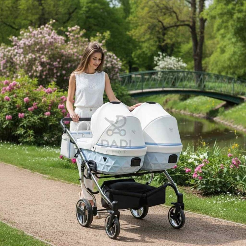 Poczuj wyjątkowość, prowadząc ekskluzywny wózek bliźniaczy, który przyciąga uwagę nowoczesnym designem i diamentową strukturą gondoli. To idealne połączenie estetyki premium i troski o komfort dzieci.