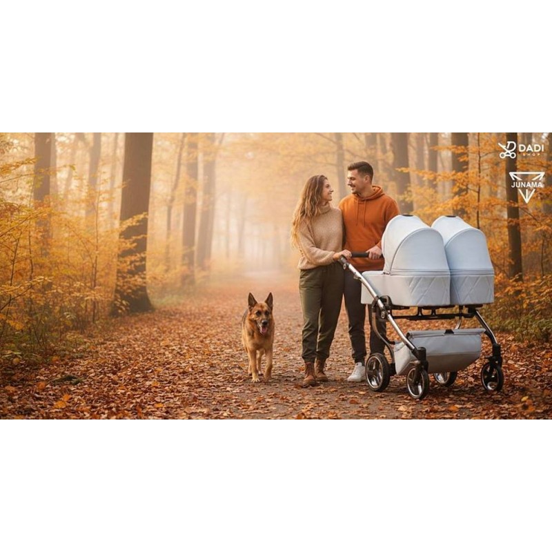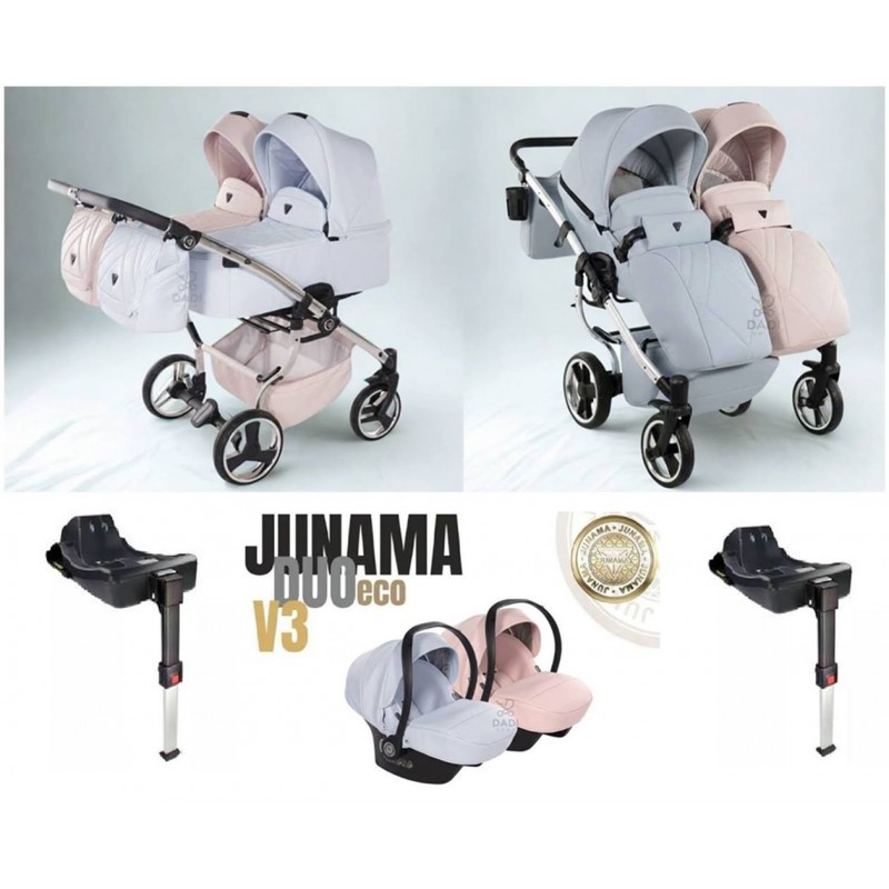 Junama Duo V3 Eco 4w1 Mix – wózek bliźniaczy wielofunkcyjny z fotelikami i bazami ISOFIX. Komfortowe gondole i spacerówki obok siebie, kompaktowa szerokość 78 cm, idealny dla dziewczynki i chłopca. Bezpieczny i elegancki zestaw premium dla dwójki dzieci.