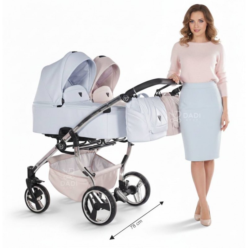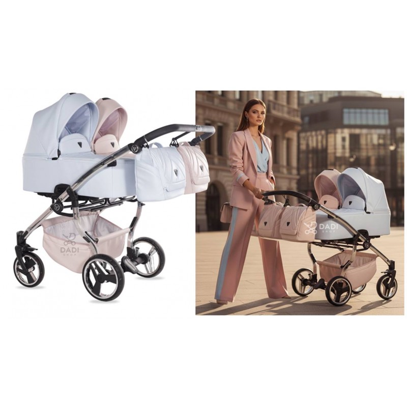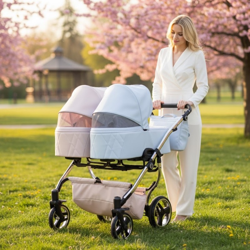 Nowoczesny styl, modowy charakter i komfort premium – wózek, który pięknie wpisuje się w codzienne życie z bliźniętami.