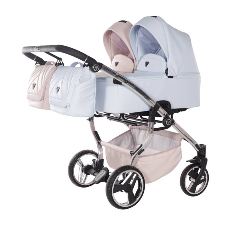 Dwukolorowy wózek duet w pastelowym różu i błękicie – dla dziewczynki i chłopca.