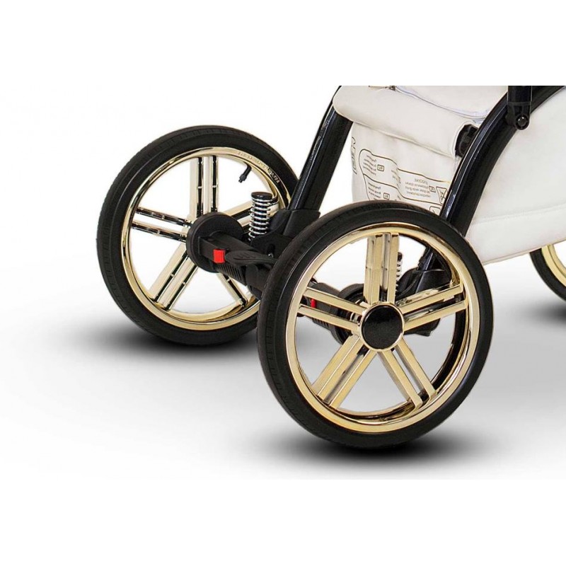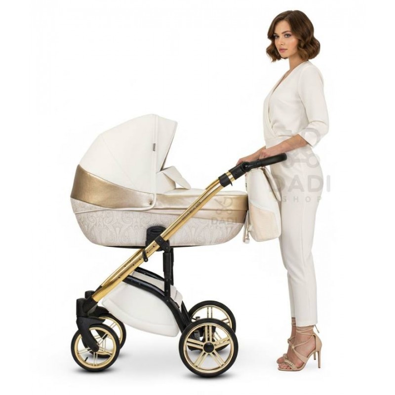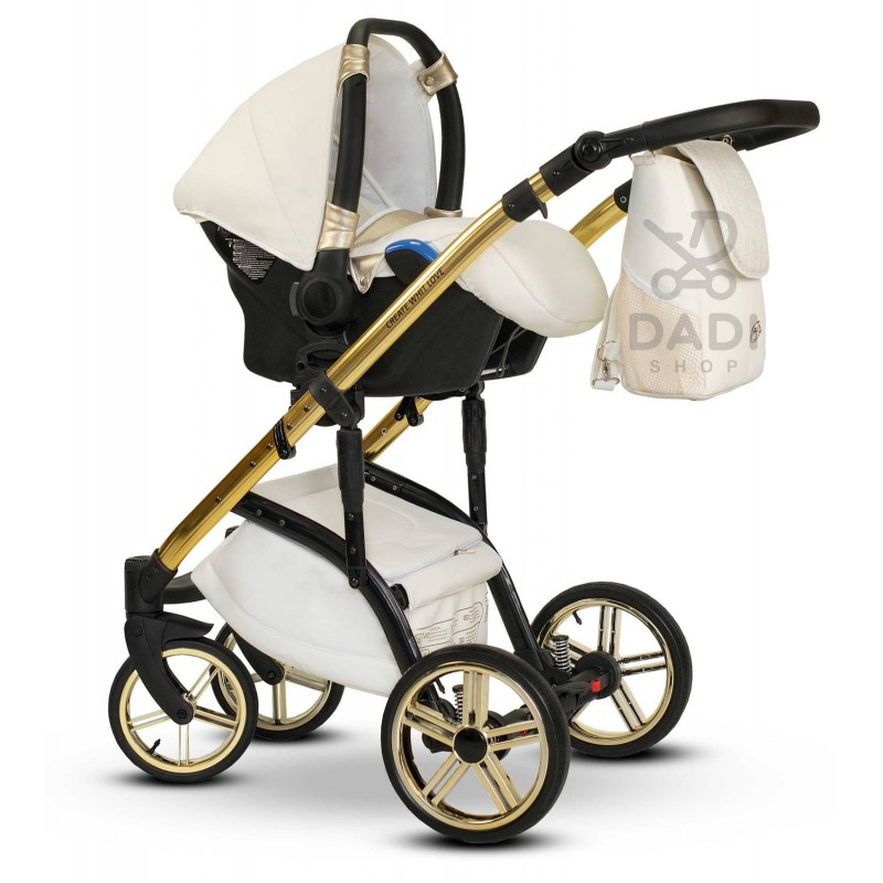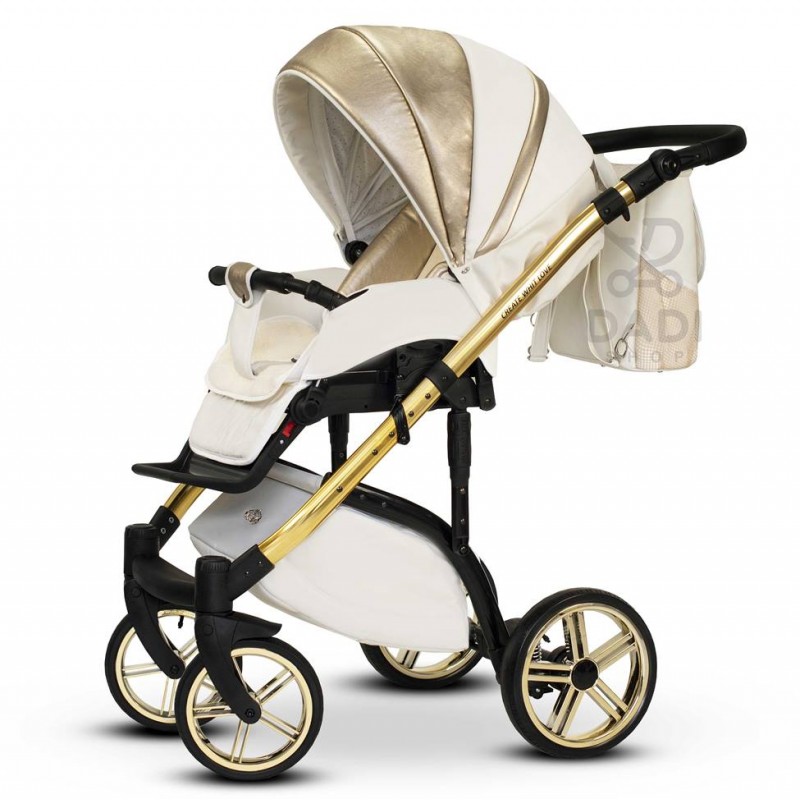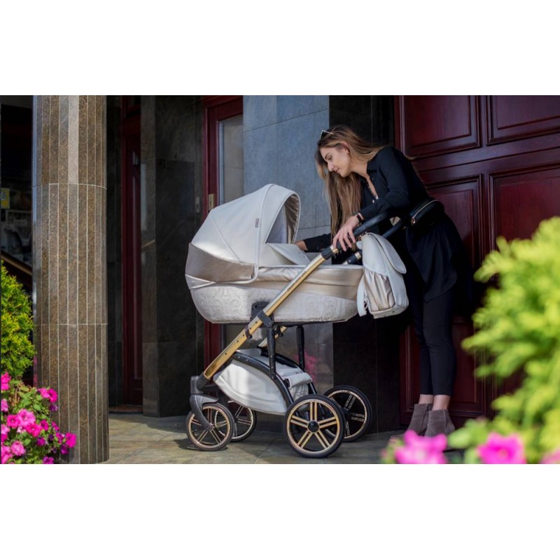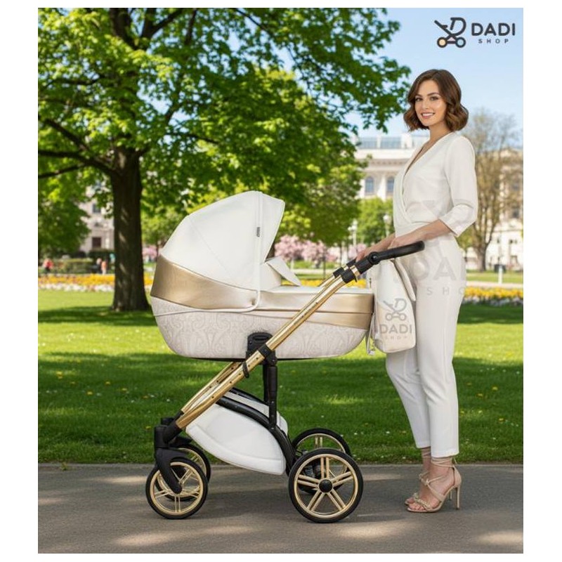 Subtelne złote detale i jasny beżowy design sprawiają, że to wózek idealny dla dziewczynki, której rodzice nie chcą wybierać między bajkową estetyką a inżynieryjną doskonałością.
