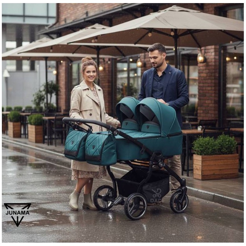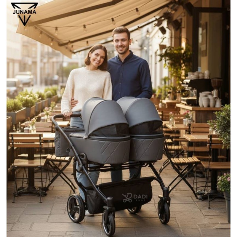 Junama Duo V3 03 – elegancki, wąski (78 cm) wózek bliźniaczy 2w1, który zapewnia komfort dzieciom i swobodę rodzicom podczas miejskich spacerów.