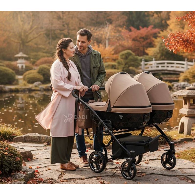❤️ Beżowe gondole otulają maluchy ciepłem. Podwójna przygoda w eleganckim wydaniu.
