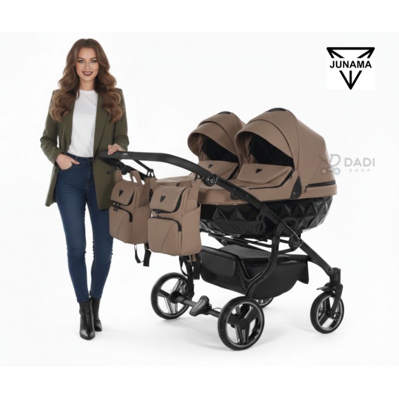 Wózek bliźniaczy 3w1 Junama Duo Diamond Basic w eleganckim brązowym kolorze 04 łączy nowoczesny design, komfort i funkcjonalność – idealny na spacery w plenerze.