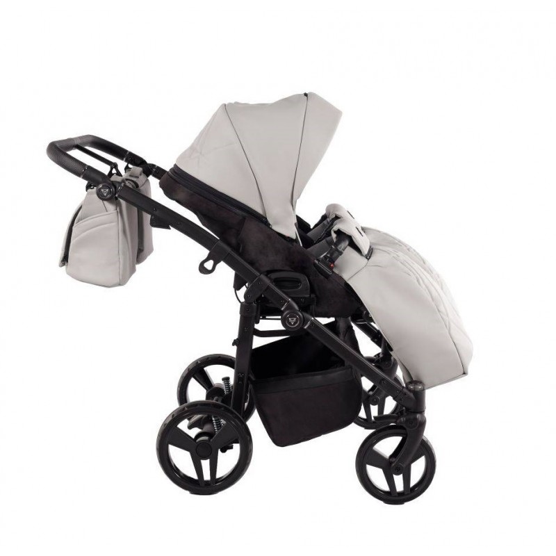 Każdy element zestawu został idealnie dopasowany kolorystycznie do szarej tapicerki z eleganckiej ekoskóry, co podkreśla spójny, stylowy wygląd całego wózka.
