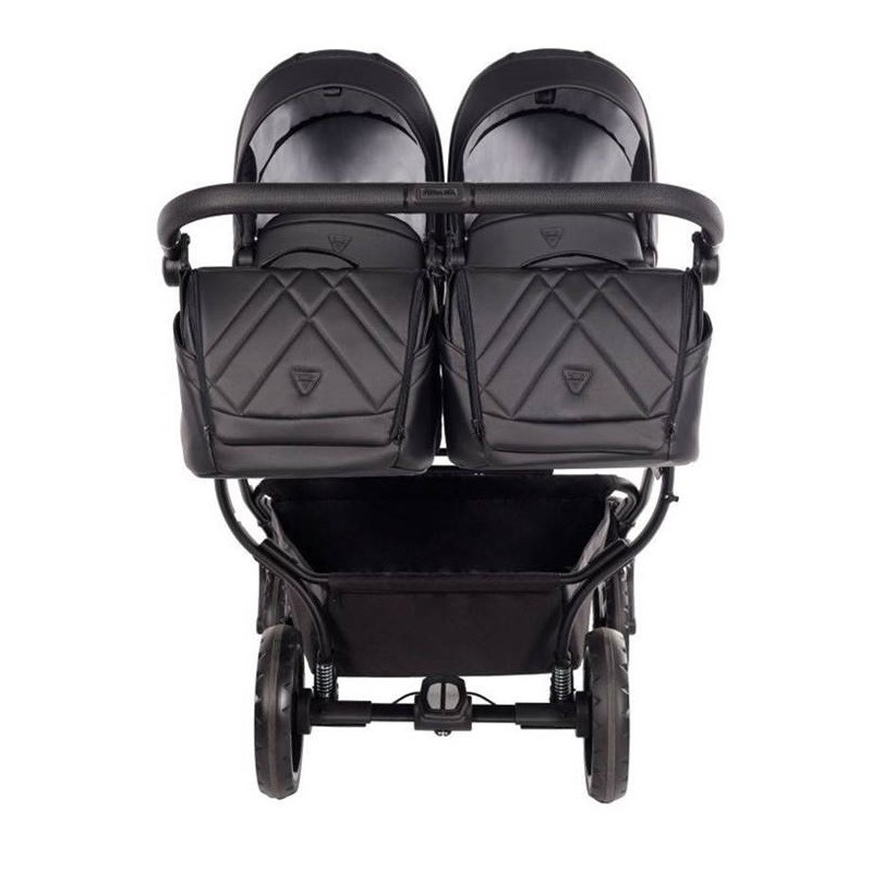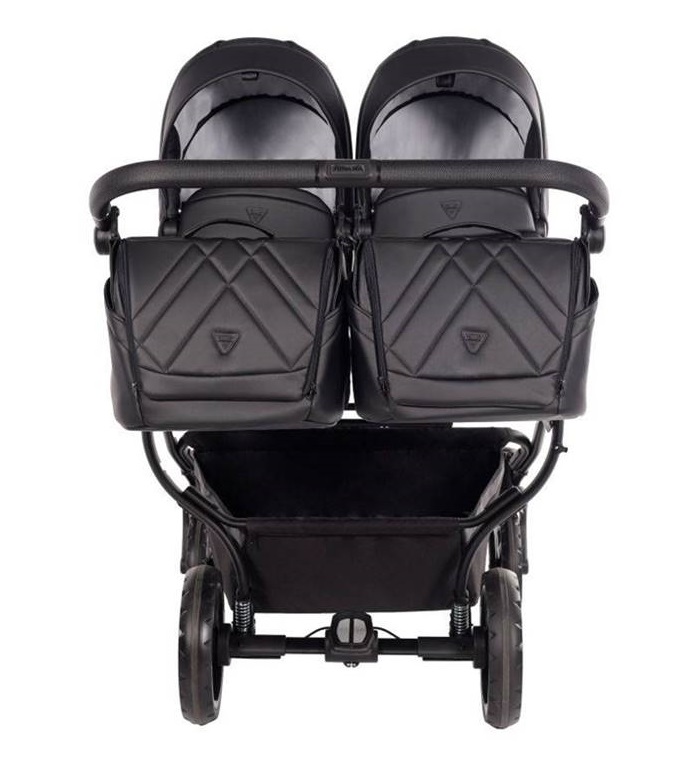 Kompletną funkcjonalność wózka dla bliźniąt – eleganckie gondole, torby i stelaż w jednym ujęciu.