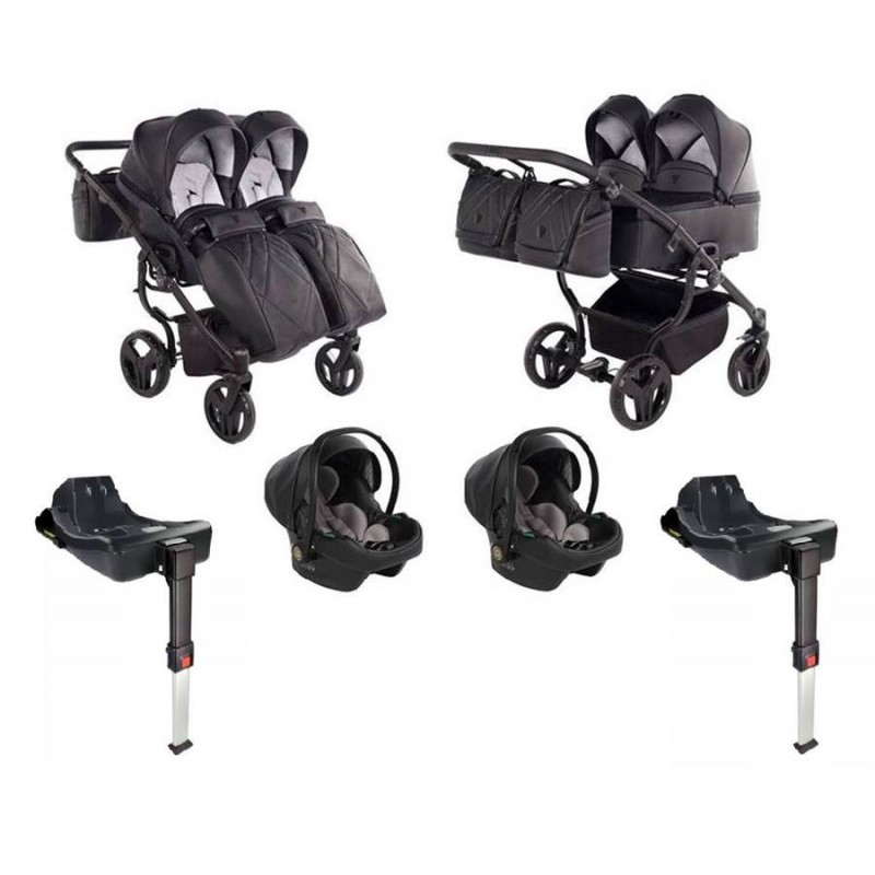 Zestaw 4w1 zawiera: stelaż, 2 gondole, 2 spacerówki, 2 foteliki samochodowe z bazami Isofix, torby pielęgnacyjne z przewijakami, folie przeciwdeszczowe, moskitiery oraz uchwyty na kubek.