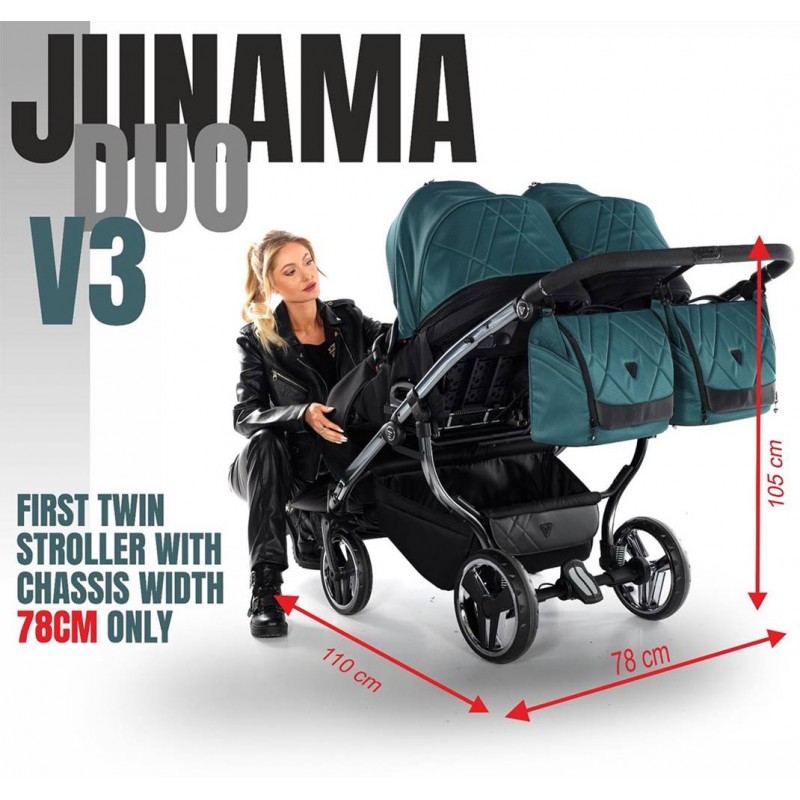 Junama V3 Duo to nowoczesny wózek bliźniaczy, stworzony specjalnie w celu spełnienia oczekiwań wymagających rodziców. Ten innowacyjny model podwójnego wózka pozwala dzieciom siedzieć obok siebie, zapewniając im bliskość i komfort podczas każdego spaceru. Dzięki starannie zaprojektowanej konstrukcji i wysokiej jakości materiałom, wózek Junama V3 Duo gwarantuje nie tylko bezpieczeństwo, ale także stylowy wygląd. Zadbaj o wygodę swoich dzieci i odkryj doskonałe rozwiązanie w postaci wózka Junama V3 Duo, który spełni wszystkie Twoje oczekiwania. Szerokość wózka wynosi jedynie 78 cm co jest dużym ułatwieniem w przemieszczaniu.