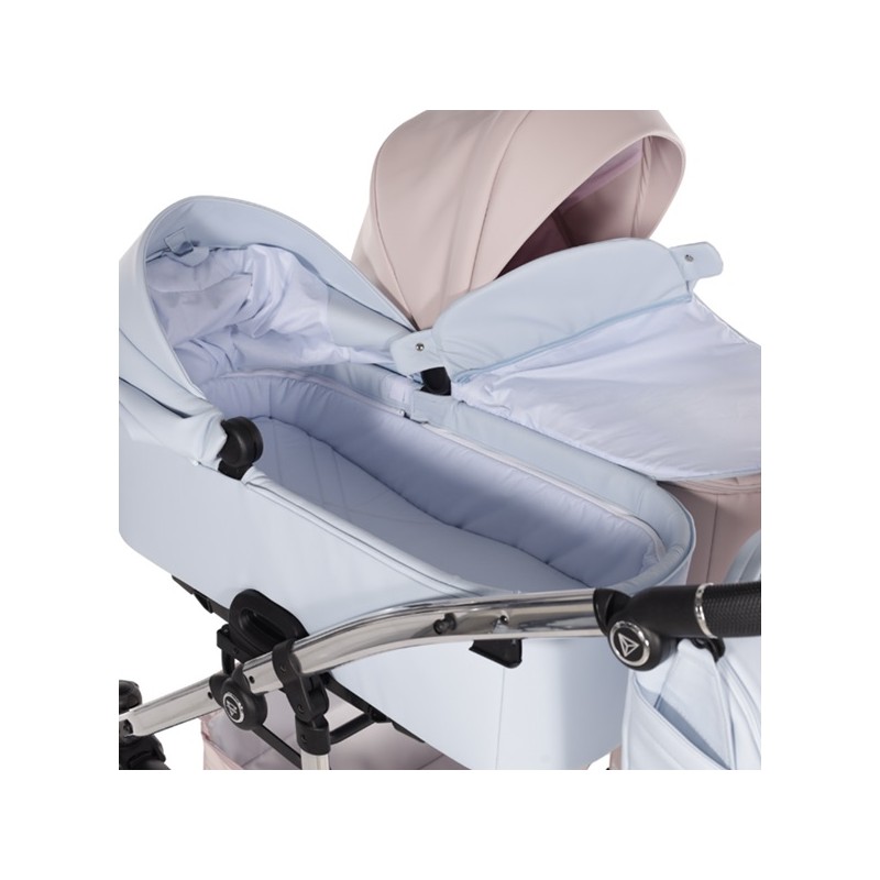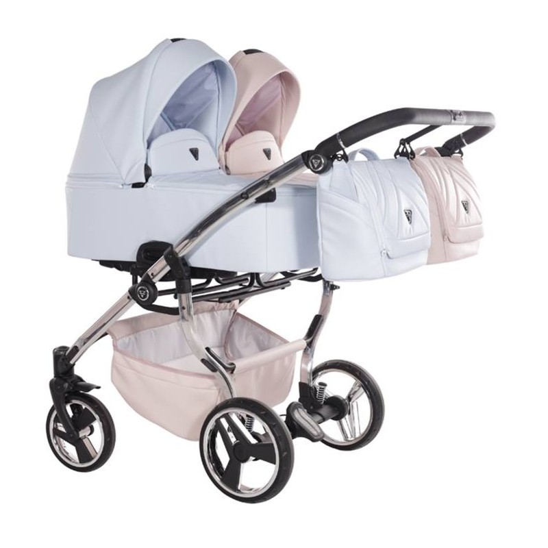 Wózek dla dwójki dzieci Junama Duo V3 Eco 2w1 Mix łączy pastelowy róż i błękit – idealny dla bliźniąt różnej płci. Dwukolorowa tapicerka z eleganckiej ekoskóry nadaje wózkowi nowoczesny, premium charakter, który wyróżnia się na tle klasycznych modeli.