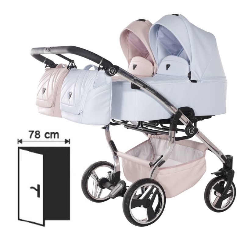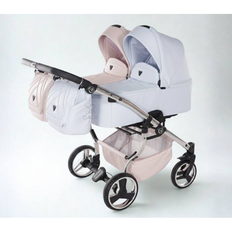 Junama Duo V3 Eco 2w1 Mix to dwukolorowy wózek bliźniaczy premium w pastelowym różu i błękicie, stworzony z myślą o bliźniętach różnej płci. Oferuje komfortowe gondole i funkcjonalne spacerówki na lekkim, stabilnym stelażu o szerokości tylko 78 cm, który bez problemu mieści się w standardowych drzwiach. Elegancka ekoskóra, intuicyjna obsługa i przemyślana ergonomia sprawiają, że to idealny wybór dla rodziców ceniących wygodę, styl i praktyczne rozwiązania na co dzień.