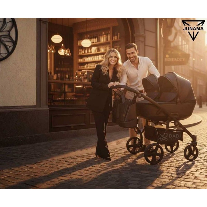 Junama Space Duo ECO 3w1 to wózek bliźniaczy klasy premium, który daje dwójce dzieci równy komfort od pierwszych dni. Gondole jeden obok drugiego, eko skóra i foteliki w zestawie sprawiają, że każdy spacer i podróż są prostsze, bezpieczniejsze i stylowe.