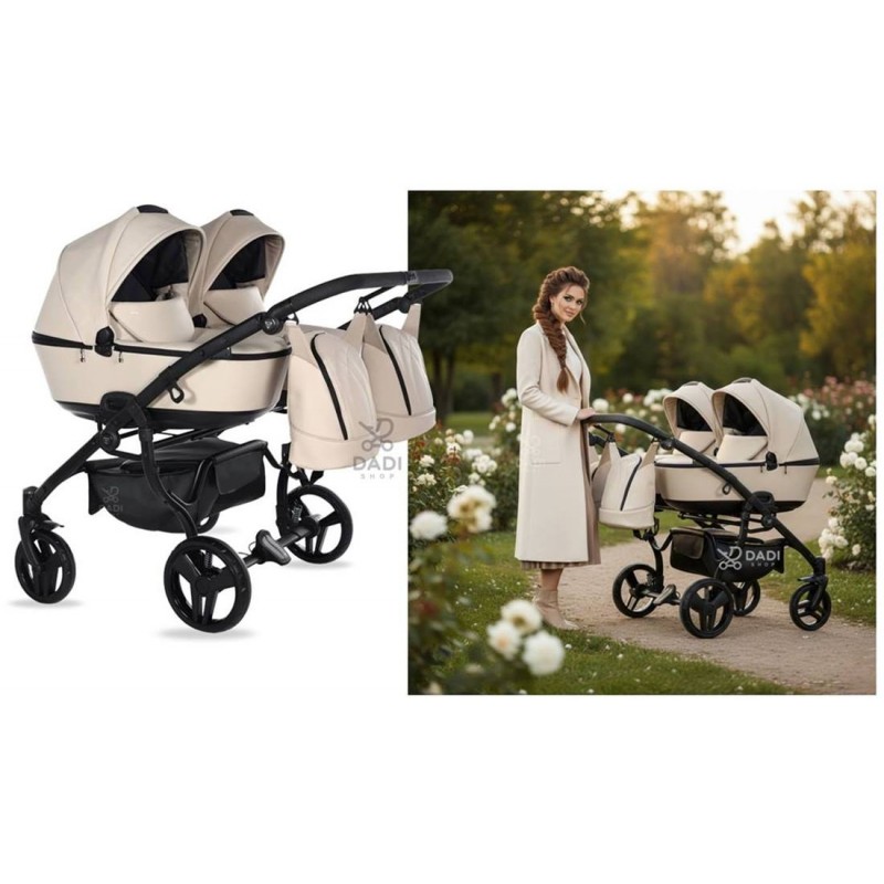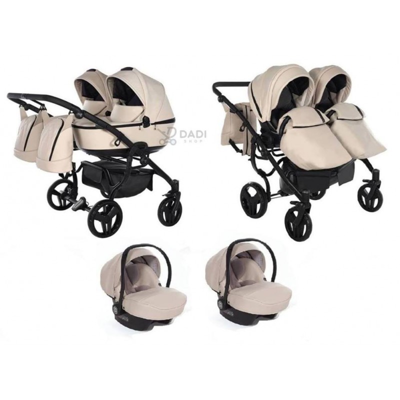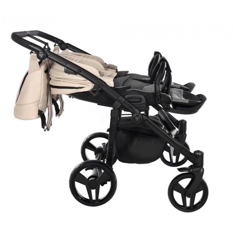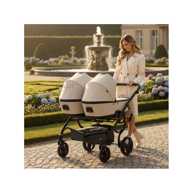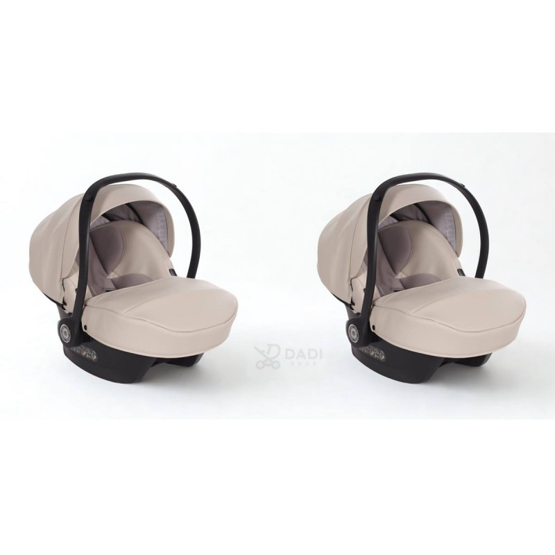 Dwa foteliki samochodowe (grupa 0- 13 kg Cosmo i-size ) wraz z kompletem adapterów montażowych na stelaż wózka. Foteliki są kolorystycznie dopasowane do eleganckiej tapicerki Latte, tworząc spójny wizualnie zestaw premium.