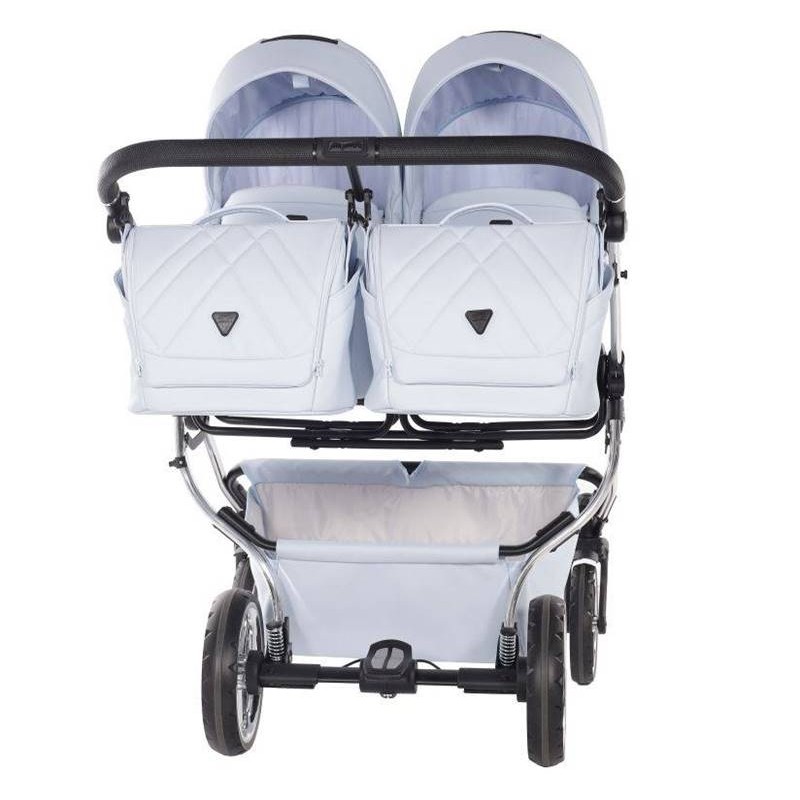 Kompletną funkcjonalność wózka dla bliźniąt – eleganckie gondole, torby i stelaż w jednym ujęciu.