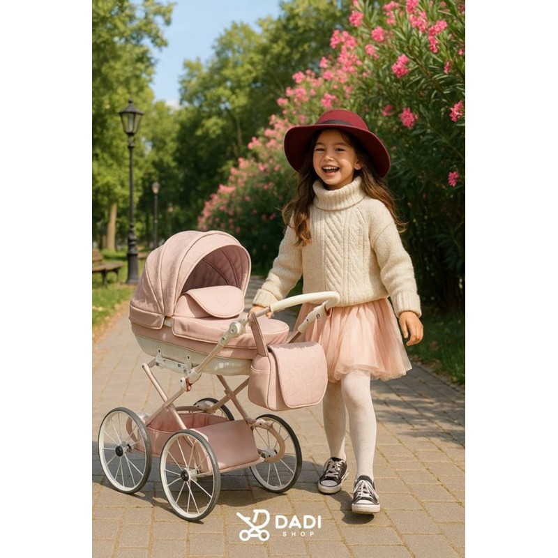 Junama Heart Mini w białym retro stylu to duży wózek dla lalek, który łączy elegancję z komfortową i radosną zabawą dla dziewczynek.