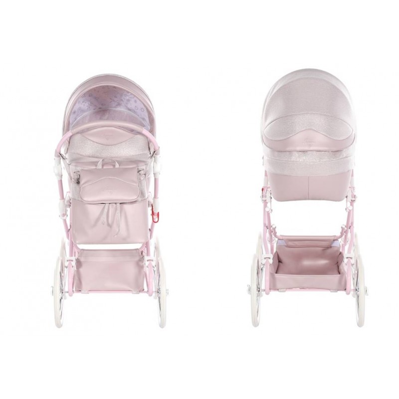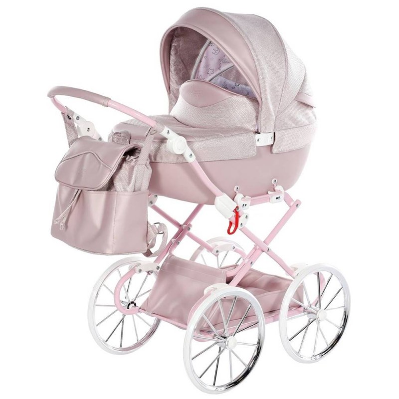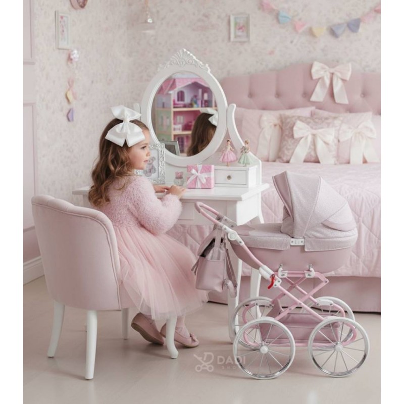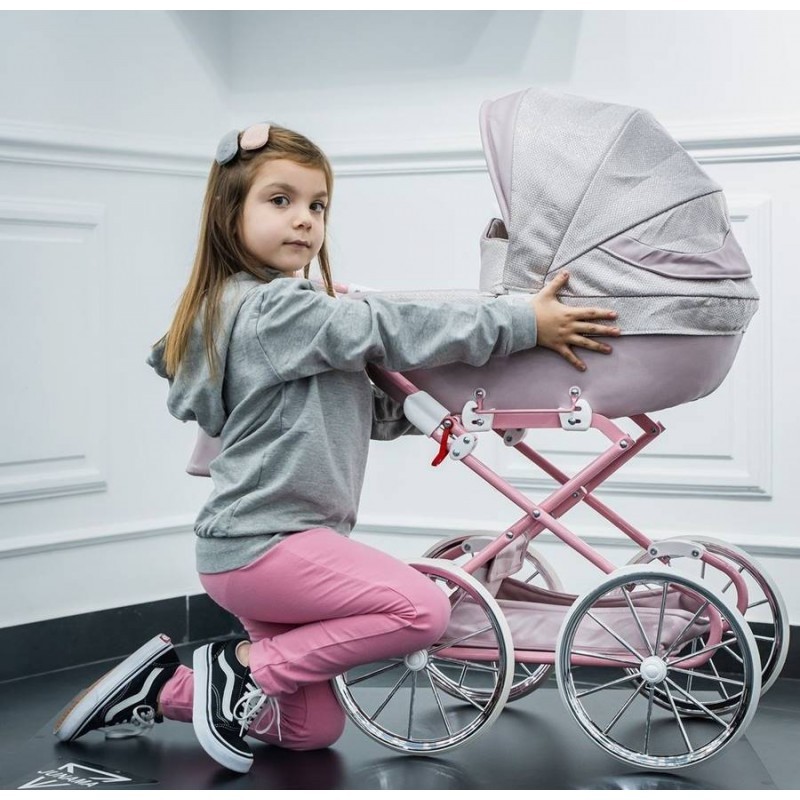 Wózek dla lalek Dolce Mini w kolorze różowym, idealny dla dziewczynki w wieku 6-8 lat, przypominający prawdziwy wózek.