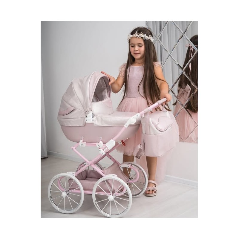 Pudrowo-różowy wózek dla lalek Junama Dolce to prawdziwa klasyka w miniaturze – duże, eleganckie koła i retro styl sprawiają, że każda zabawa zamienia się w wyjątkowy spacer jak z prawdziwym wózkiem dziecięcym.