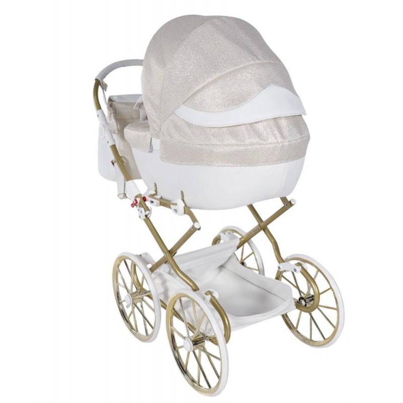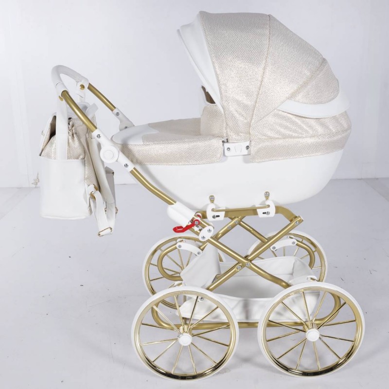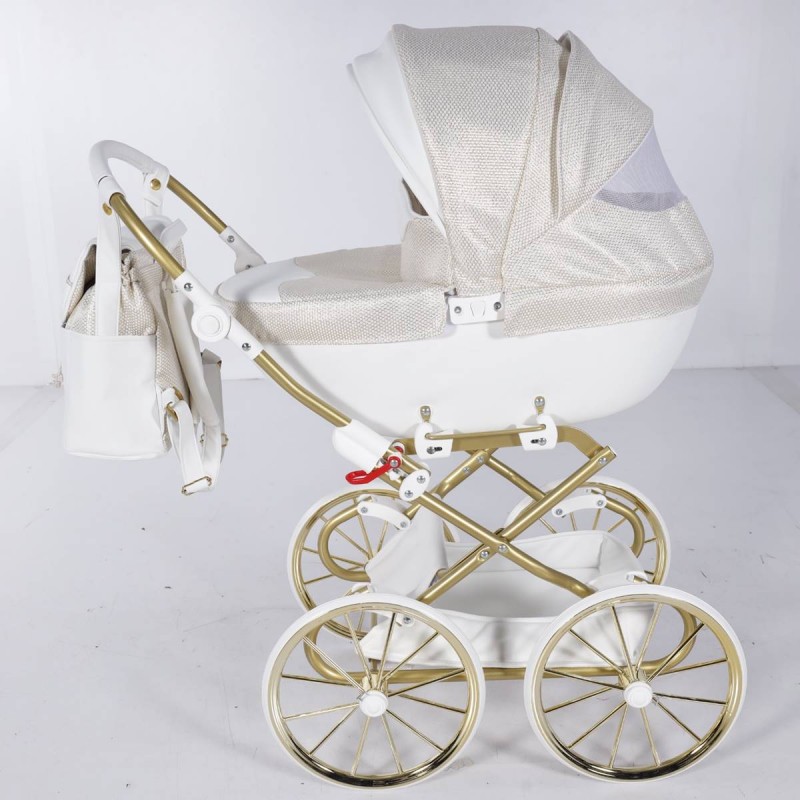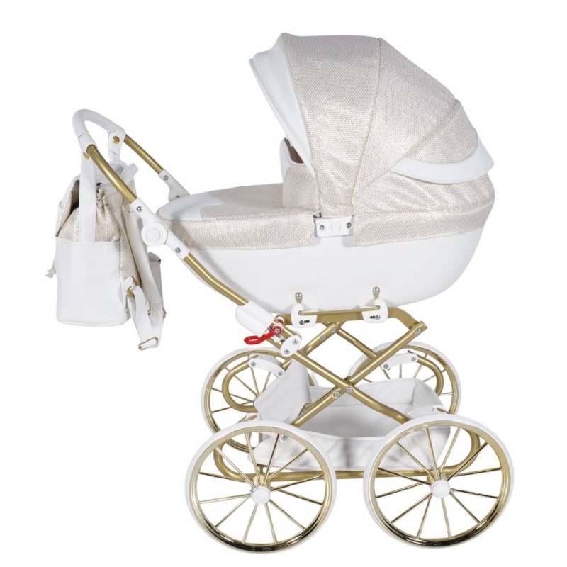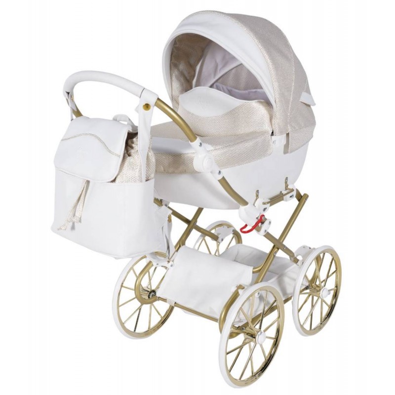 Biało-złoty wózek Junama Dolce Mini z głęboką gondolą zachwyca klasą i stylem.