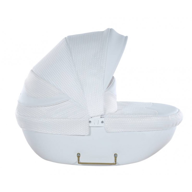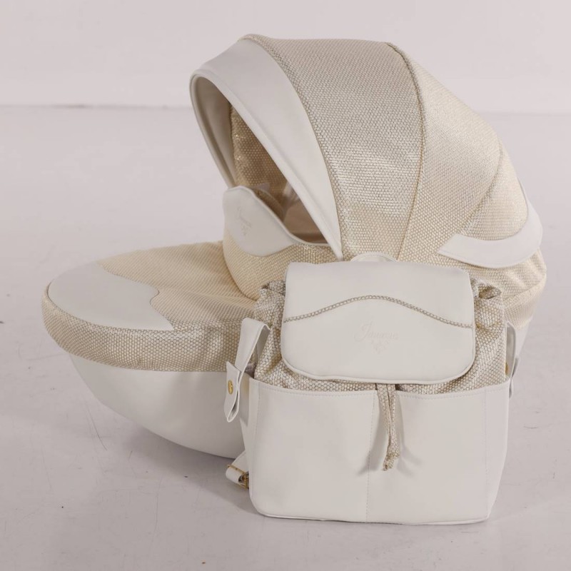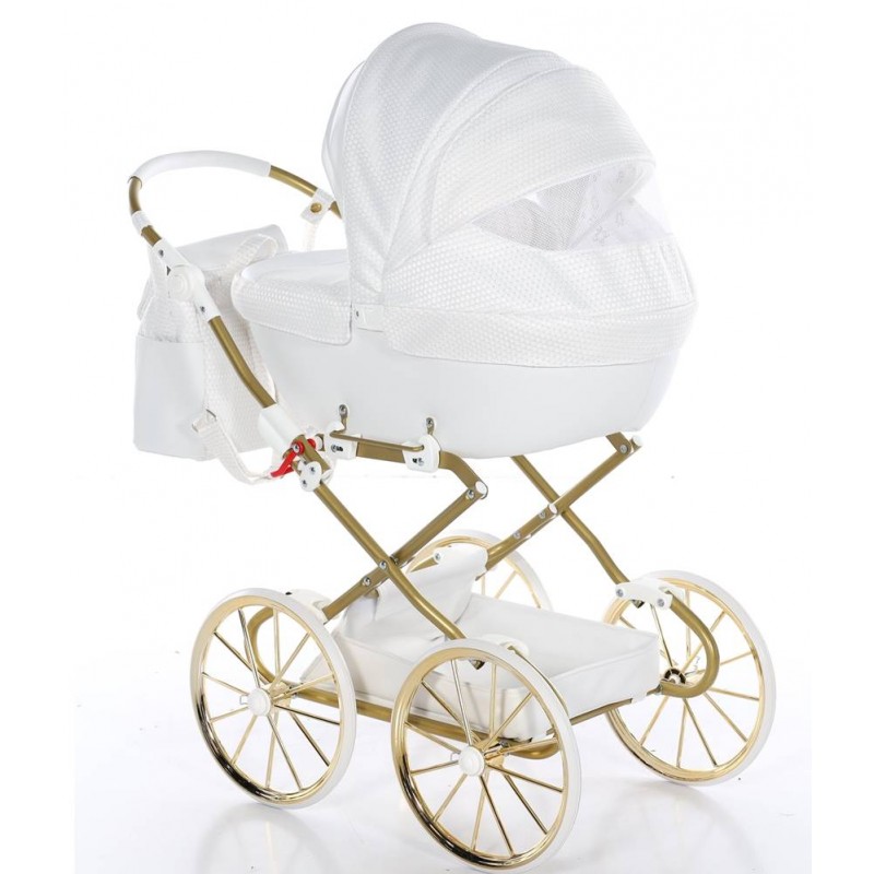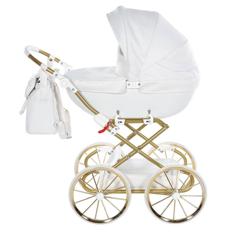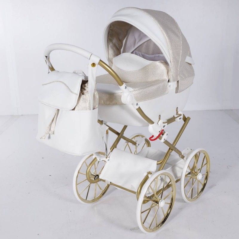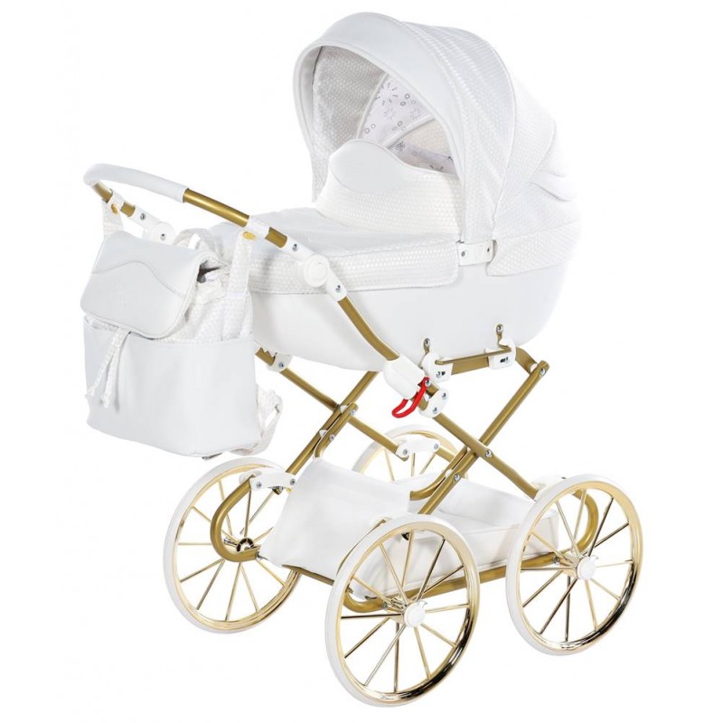 Biało-złoty wózek Junama Dolce Mini z głęboką gondolą zachwyca klasą i stylem.