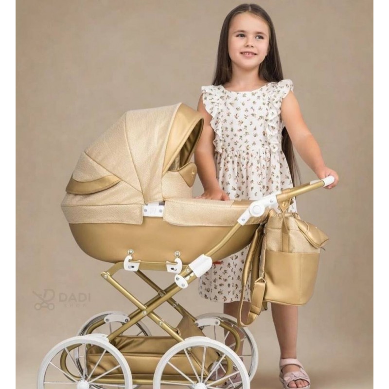 Przedstawiamy DOLCE MINI Kolor 07 White Gold – wózek dla lalek wykonany z ekoskóry w bieli, osadzony na złotej ramie, tworząc prawdziwie królewski zestaw utrzymany w tradycyjnej stylistyce. Zabawka dla małych dziewczynek, wózek dla lalek DOLCE MINI, zachwyca dużymi smukłymi kołami retro, prezentując niezwykłą elegancję od polskiego producenta TAKO, znanego z klasy i jakości. TAKO zgrabnie dostosowało model Dolce JUNAMA do wersji Mini, sprawiając, że ten wózek dla lalek wygląda jak prawdziwy. Z głęboką gondolą i regulowaną rączką do wzrostu dziecka, to nie tylko zabawka – to miniaturowe arcydzieło, które można składać.