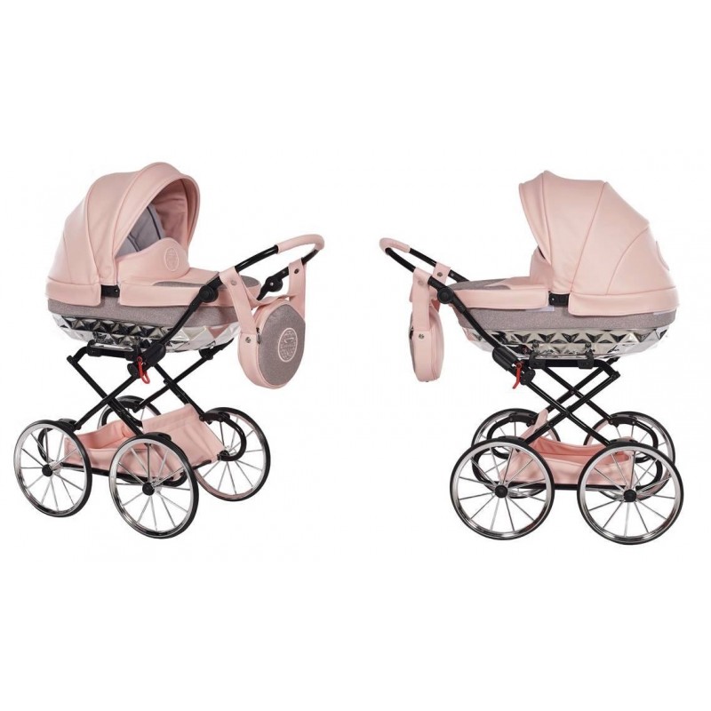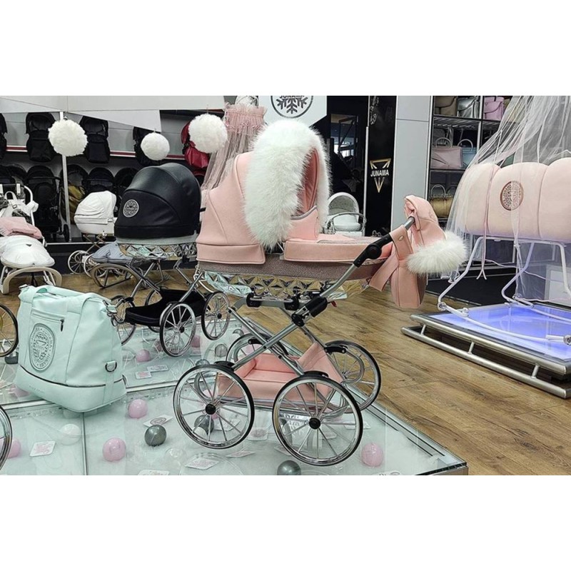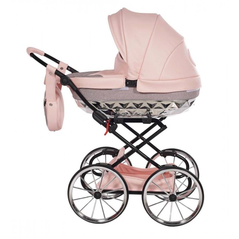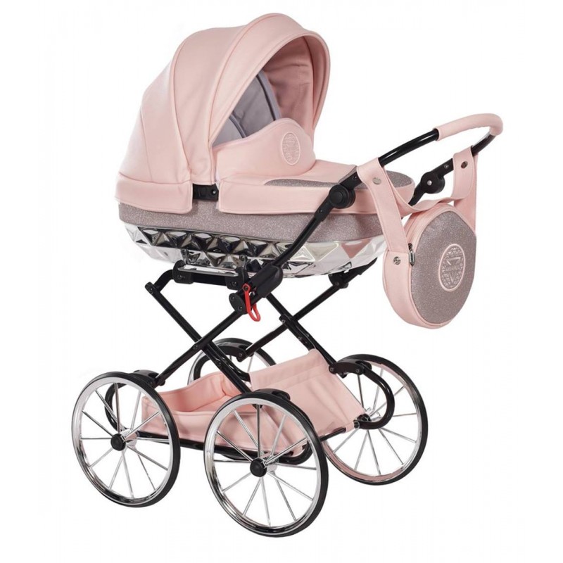 Kolor 01 w wózku Junama Hand Craft Glitter to subtelny, jasnoróżowy odcień, który dodaje elegancji. Dół gondoli jest w srebrnym kolorze, a wokół niej połyskuje brokatowy materiał w różowych tonach, co nadaje całości wyjątkowego blasku.
