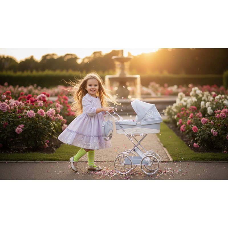 Duży wózek dla lalek Junama Lulla retro 02 niebieski – idealny towarzysz dziecięcych spacerów, który łączy elegancję, wygodę i styl retro ze sklepu Dadi-Shop.