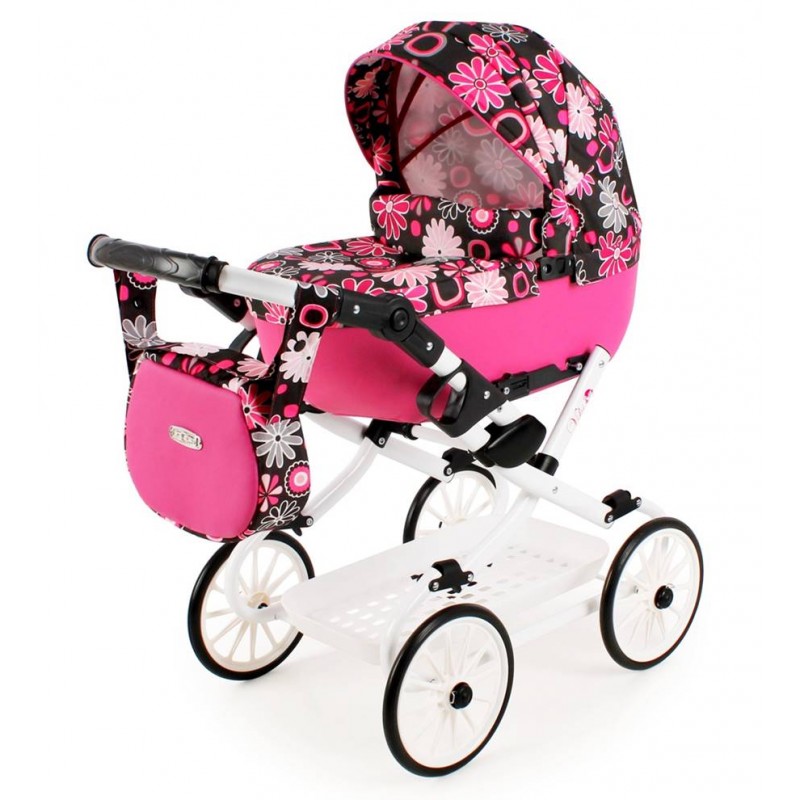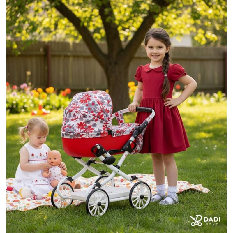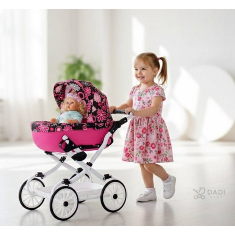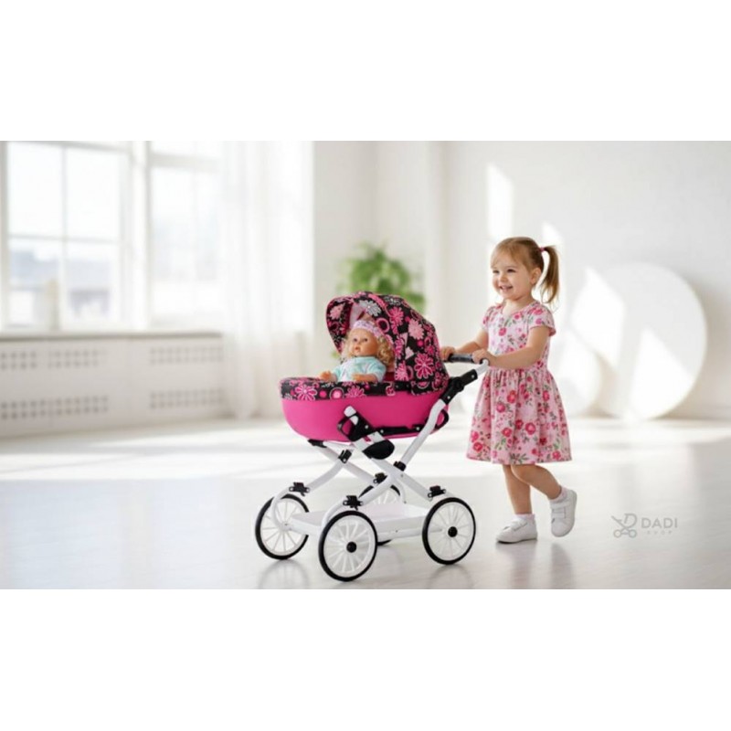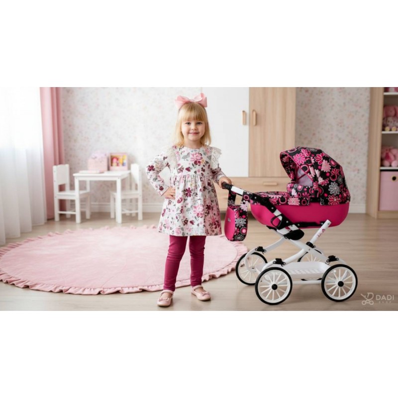 Ten uroczy wózek dla lalek w odcieniach różu, czerni i popielu, z eleganckim wykończeniem, przyciąga wzrok i daje frajdę podczas zabawy. Gondola zdobiona jest delikatnym wzorem kwiatuszków, a jej dół obszyty elegancką ekoskórą, co dodaje całości uroku i subtelnej elegancji. Idealnie sprawdza się zarówno w domu, jak i na świeżym powietrzu.