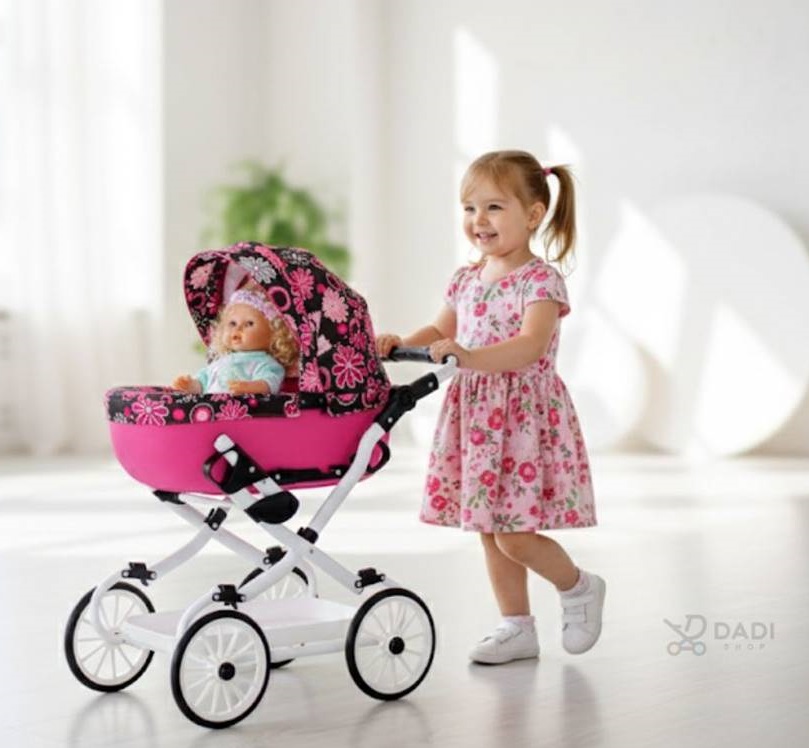 Twoja córeczka pokocha spacery z wózkiem dla lalek Adbor VIKI – składany stelaż i gondola w różowe kwiatuszki sprawiają, że każda zabawa staje się elegancką i radosną przygodą.