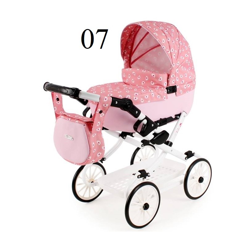 Przytulne wnętrze gondoli w wózku lalkowym Adbor VIKI z różowymi kwiatuszkami i składanym daszkiem zapewnia realistyczną zabawę i komfortową opiekę nad lalką.