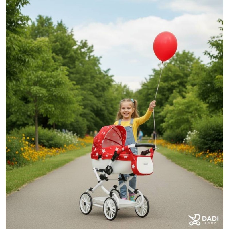 Czerwony wózek dla lalek Adbor VIKI 06 w plenerze to idealny prezent, który rozwija wyobraźnię i daje dziecku mnóstwo radości podczas kreatywnej zabawy.